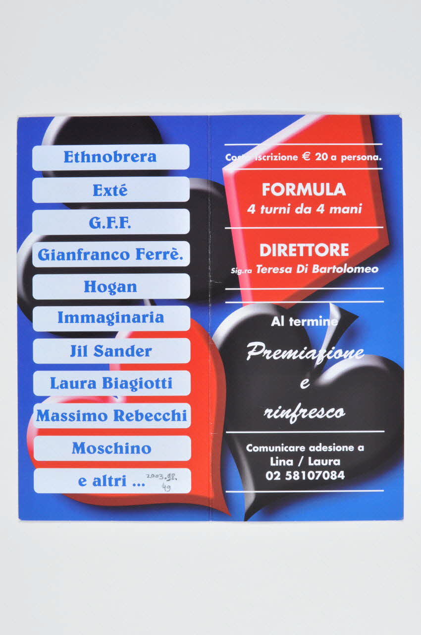 Ce dépliant en italien est constitué d'une feuille de carton imprimée et pliée en deux.