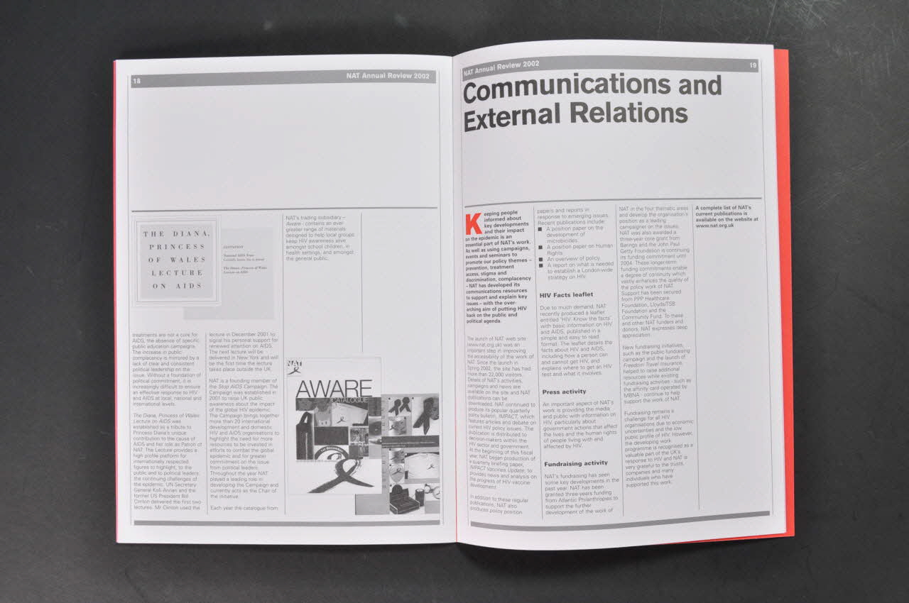 Résumé: - Message du directeur de l'association - Qu'est ce que NAT ? - (en noir et blanc sur fond rouge) :"12.300 décès par le sida ont été recensés en Grande Bretagne jusque fin 2001 - le rôle de plaidoirie et de lobbying de NAT - le VIH en Grande Bretagne en 2002 - résumé des activités de l'association (photo de manifestation avec banderole "AIDS Treatment now") - (en noir et blanc sur fond rouge) : "2001 a vu le plus grand nombre de personnes diagnostiquées comme séropositives dans le Royaume Uni." - Activités de prévention : développement d'une stratégie pour Londres - (en noir et blanc sur fond rouge) : "Chaque année le nombre de personnes vivant avec le virus augments de plus de 10%" - (en noir et blanc sur fond rouge) : "Dans le monde, 6 personnes meurent du sida à chaque minute." - détails sur le programme de NAT : Développement de l'approche du VIH : Droits de l'homme; recherche en sciences sociales, politique publique, politique dans les régions du Royaume Uni, aide à la participation des personnes vivant avec le VIH - La prévention du VIH : développement d"'une stratégie pour Londres ; prévention spécifique pour les communautés africaines ; communautés gays ; usagers de drogue par injection - Accès au traitement - Stigma et discrimination (camapgne : are you HIV prejudiced ?) - Leadership : rôle de la princesse Diana, campagne "stop AIDS", catalogue "Aware" - Communication et relations externes - (en noir et blanc sur fond rouge) : " Dans le monde, plus de 8.000 personnes meurent du sida chaque jour." - Projets - (en noir et blanc sur fond rouge) : "Dans le monde, il y a 3 millions d'enfants vivant avec le VIH" - L'équipe de NAT - Bilan financier.