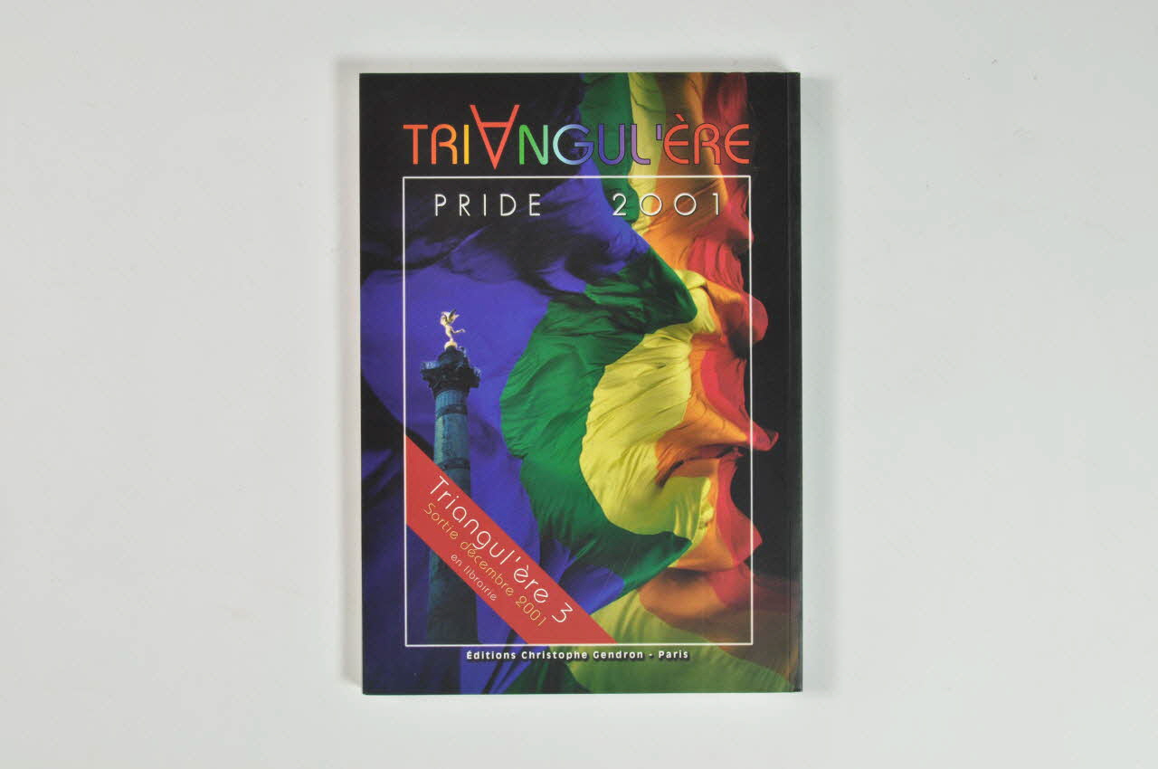 Livre abondamment illustré avec des photos couleur pleine page. Couverture sur fond noir avec montage photographique. Cadre central surplombé du titre de la revue en caractères arc-en-ciel : "Triangul'ère" (le "A" en rose, à l'envers). Le montage représente la tour Eiffel, des manifestant dansant avec des drapeaux arc-en-ciel, la colonne de la place de la Bastille à Paris, le tout fondu dans un grand drapeau arc-en-ciel flottant. Inscription "Pride 2001" en partie supérieure du cadre. En partie inférieure "Editions Christophe Gendron - Paris". 4ème de couverture relativement similaire (uniquement le drapeau et la colonne de la Bastille). Cadre coupé d'un beandeau rouge avec inscription "Triangul'ère 3. Sortie décembre 2001 en librairie". La revue est numérotée 2 1/2 sur la tranche. A l'intérieur, la revue commence à la page 578, avant le sommaire par une série de pages publicitaires sur double pages : champagne, Virgin Mega Store, site internet. Pages de titre : "Nos années Pride. photo couleur sur 2 pages : Gay pride 1999. on voit Lang et Delanoë p. 590-591 Sommaire p. 592 à 594 Photos noir et blanc de gays pride 1977, 1981, 1988, 1992, 1996, 1997, 1998, 2000. p. 595-598 René Lalement : Lesbian et Gay Pride IDF p. 599 Charles Myara Sofiged LGP-IDF 2001 (Société Financière de Gestion de Droits) p. 602-3 Photo double page : 1997 char "iem" place de la Bastille p. 604-5 Christian Dubs. Interpride 2001 p. 606-7 Photo double page : 1995 Minute de silence place de la Bastille p. 608 et 609 Cartes du CRIPS (préservatif) p. 610-616 Michael Sibalis : L'histoire d'une Gay Pride 1977-2001 (photo noir et blanc de Gay Pride Sidaïque 1987 Palais Royal et 1991) p. 617-620 Photos pleine page publicités librairie, bars p. 621 à 640 Photos couleurs de gay prides : 1996 : rue du Faubourg Saint Anoine, et détail / 1996 : soirée finale à Bercy et détails, / 1992 Pom pom girls d'Act Up et photo banderole "Fières" (dans collecte) / 1989 Les majorettes du Quetzal place de la Bastille (et détails) / 1993 Marie-Madeleine en chemin de croix place de la République / 1986 les CRS : photo noir et blanc et 1995 détail couleur / 2000 char "asmf" Bd St Germain et détail / 1995 Soeur de la perpétielle indulgence et diable / 1990 Quelques banderoles associatives / 1995 p. 641 à 649 Doubles pages couleur publicitaires : vêtements, librairie, bars p. 650-653 expositions de photos noir et blanc d'Orion Delain : Le temps d'un regard (exposition Europride 1997 Paris) (photos de personnalités fondatrices des mouvements gaylesbien) p. 654-5 Photo : réunion-débat Lesbian & gay Pride, bar du duplex, 17 juin 1991 sur "le sida et notre quotidien" p. 656-661 Jean Le Bitoux . Mémorial de la déportation homosexuelle. Avec double page de photos du dépôt de la gerbe à Paris, le 29 avril 2001, en mémoire des déportés homosexuels par les nazis p. 662-663 Nathalie Rubel. Coordination lesbienne nationale p. 664-667 Christine Le Doaré : SOS Homophobie avec photo double page noir et blanc de la banderole de l'association à la Gay Pride 2000 p. 668-9 Denis Quinqueton : Pacs et coetera p. 670-671 Double page photo couleur Carré de tête à la Lesbian & Gay Pride 1999 p. 672-673 François Vauglin Homosexualités et socialisme p. 674 Yannis Delmas : Les gais et lesbiennes branchés p. 675 Manuel F. Picaud : CGPIF. Fédération sportive gaie et lesbienne p. 676-7 Photo double page : 1990 Compétition aquatique durant la semaine Gay pride p. 678 Eric Dubreuil et Martine Gross : APGL. Association des parents et futurs parents gays et lesbiens p. 679 Rose Cosson : Contact. Parents et amis homos p. 680-1 Photo double page : 1998 Arrivée Place de la Nation (banderole : "collectif des homos sans papiers" p. 682-3 Rodriguez Guilhermo et Lionel Povert : ARDHIS. Association pour les droits des homosexuels p. 684 Rémi Rouyer : Les Gais musette p. 685 Jacques Lemonnier Les Gais retraités p. 686 Jean Thébaud Amnesty international. Commission homosexualités et droits humains p. 687 Olivier Rouchon : centre gai et lesbien p. 688-689 1996. Ambiance torride sur le char du Banana p. 690. Christophe Le Gall : ACGLSF. Association culturelle des Gais et Lesbiennes sourds de France p. 691 Philippe Berthelot : GAGE. Etudiant(e)s Gai(e)s p. 692 Norbert Wolgust Beit H'averim p. 693 Christian Nicolas David et Jopnathan . Homos chrétiens p. 694-696 Jean-Yves Le Talec : Les Soeurs de la Perpétuelle Indulgence, précédé de deux pages de photos couleur : 1992 p. 697 Vincent Blanchard : MAG Jeunes Gais et Lesbiennes p. 698 Cyril Girard : AHTP. Association homosexuelle des transports parisiens p.699 Jean-François Fiévet : GARE. Les Gays et Lesbiennes du Rail p. 700-703 Christian Saout : AIDES, précédé de deux pleines pages photo couleur : 1998 Boulevard Saint Germain : banderole :"Aides remercie le personnel soignant pour le soutien apporté aux malades du sida" / char avec ruban rouge p. 704-705 Double page photo couleur "VLS Vaincre le sida" 1995 p. 706 Didier Folus : Ecoute gaie p. 707-9 Didier Jayle : CRIPS. Centre régional d'information et de prévention sur le sida avec deux pleines pages de photo couleur de cate du CRIPs avec préservatifs p. 710-712. Emmanuelle Cosse et Arlindo Constantino. Act Up Paris (responsabilisation des homosexuels) précédé de deux pleines pages de photos d'Act up à la Gay Pride 1990 avec "miss Act Up" p. 713 René-Paul Leraton : Ligne Azur p. 714 Nathalie Magnan, David Dibilio et Florence Fradelizi : Festival de films gays et lesbiens de Paris p. 715 Edna Castello : Cineffable. Festival de films lesbiens. p. 716 Vincent Dariosecq : CGAY Les gays et lesbiennes de Canal + p. 717 Jean-François Chassagne : SNEG. Syndicat national des entreprises gaies p. 718-723 Photos couleur publicitaires pleine page : bars, restaurants, revue, europride, agence de communication p. 724 Fabienne Larrivière : Montpellier. San Francisco française (visibilité gaie dans toute la ville) p. 725