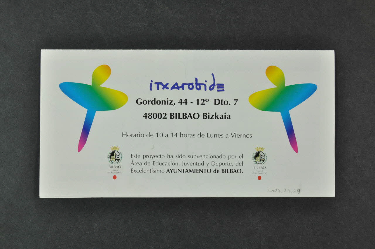 (inscription en bleu et noir sur fond blanc au dos du dépliant au milieu en haut : adresse postale d'itxarobide), versoSous-titre