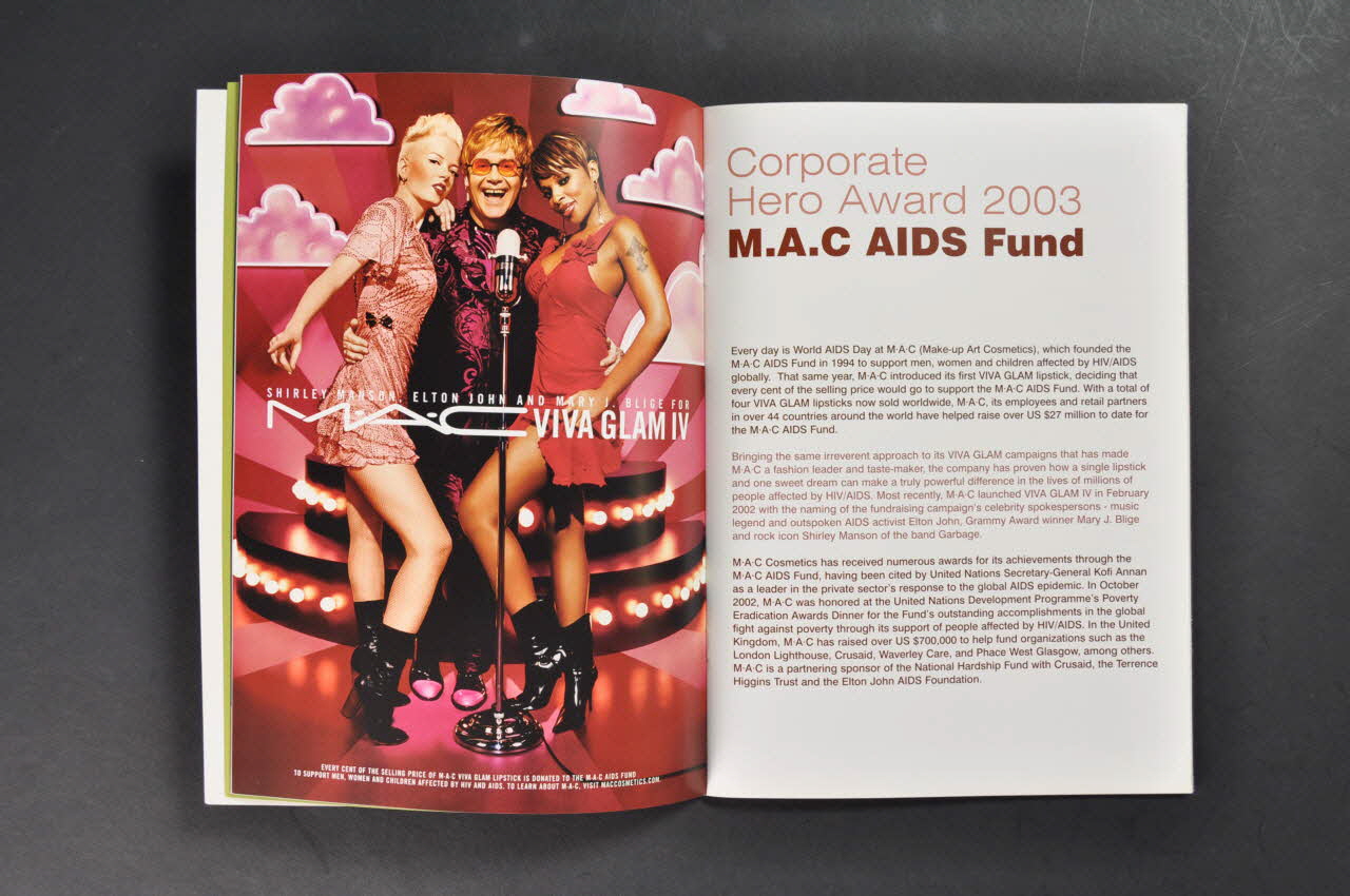 The // UKC // Hero Awards // 2003 // Thursday // 30th January 2003 // The Dorchester // Park Lane London // // British Airways // International Hero Award 2003 // Liza Minelli // [...] // Corporate Hero Award 2003 // M.A.C AIDS Fund // [...] // UKC Hero Award 2003 // (To be announced on the night) // [...] // Hosted by Gaby Roslin // Special Performance by the // OperaBabes (Face au deuxième de couverture, sur un fond rose où une silhouette se détache), à l'intérieurInscription concernant le commanditaire