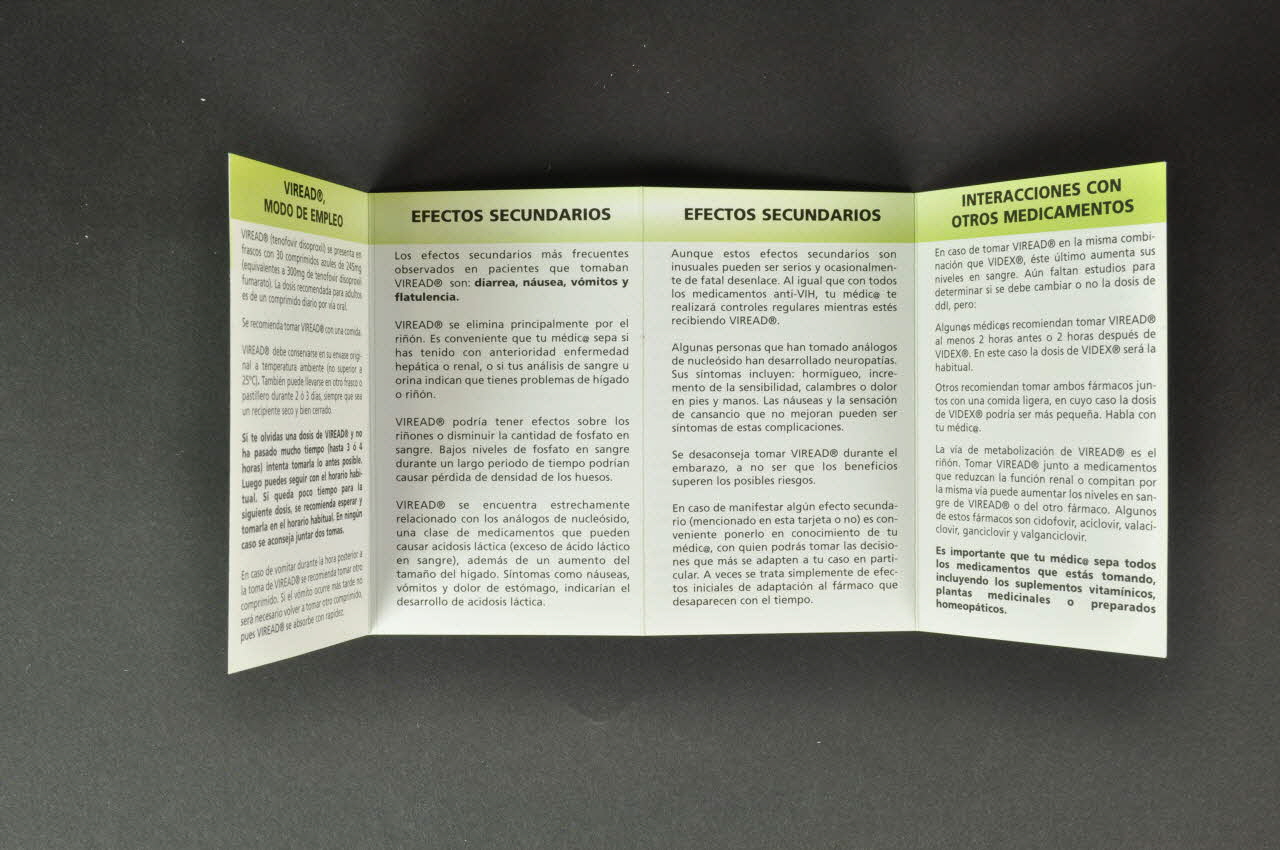 QUÉ ES VIREAD® // // POR QUÉ TOMAR VIREAD® // // VIREAD® // MODO DE EMPLEO // // EFECTOS SECUNDARIOS // // INTERACCIONES CON // OTROS MEDICAMENTOS (Titres des paragraphes à l'intérieur du livret.), à l'intérieurTexte