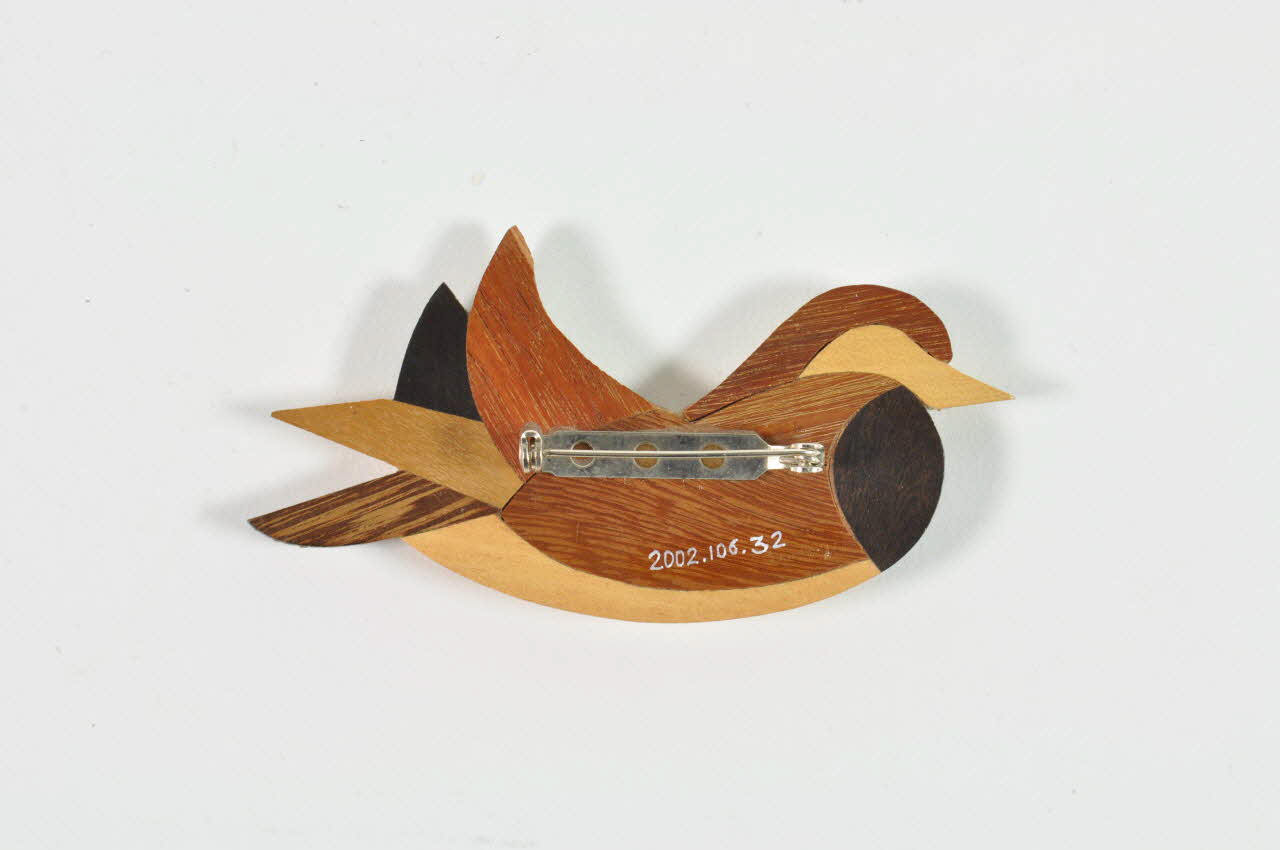 Broche représentant un oiseau en marqueterie, en camaïeu de brun. Au dos est collée une attache en métal.Décor