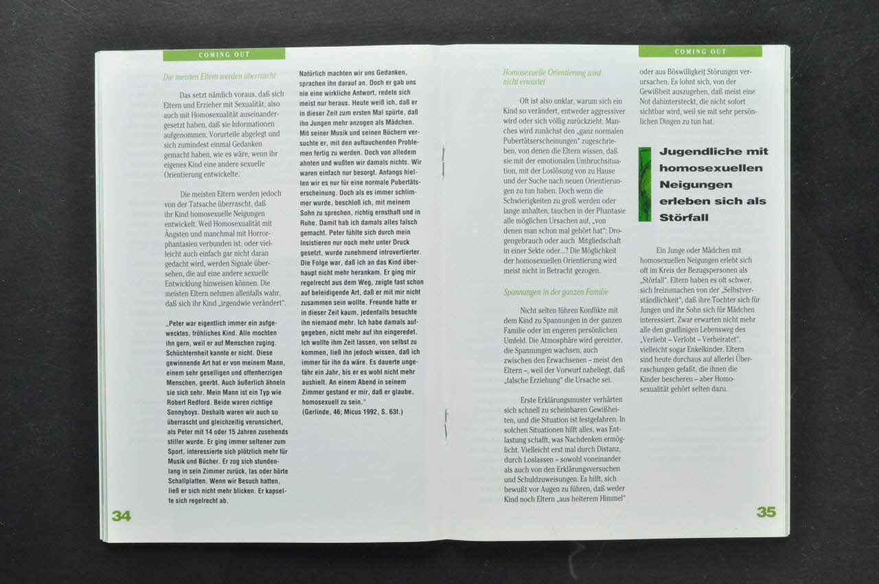 1 EINFÜRUNG // 2 VORGEBENE ROLLEN // 3 DIE EIGENE ROLLE FINDEN // 4 SEXUELLE ORIENTIERUNG // 5 HOMOSEXUALITÄT UND AIDS // 6 COMING OUT // 7 SELBSTACHTUNG // 8 COMING OUT DER ELTERN // 9 ELTERNSORGEN // 10 BRIEF AN DIE ELTERN // BÜCHERTIPS (sur la première page en différentes couleurs)Texte