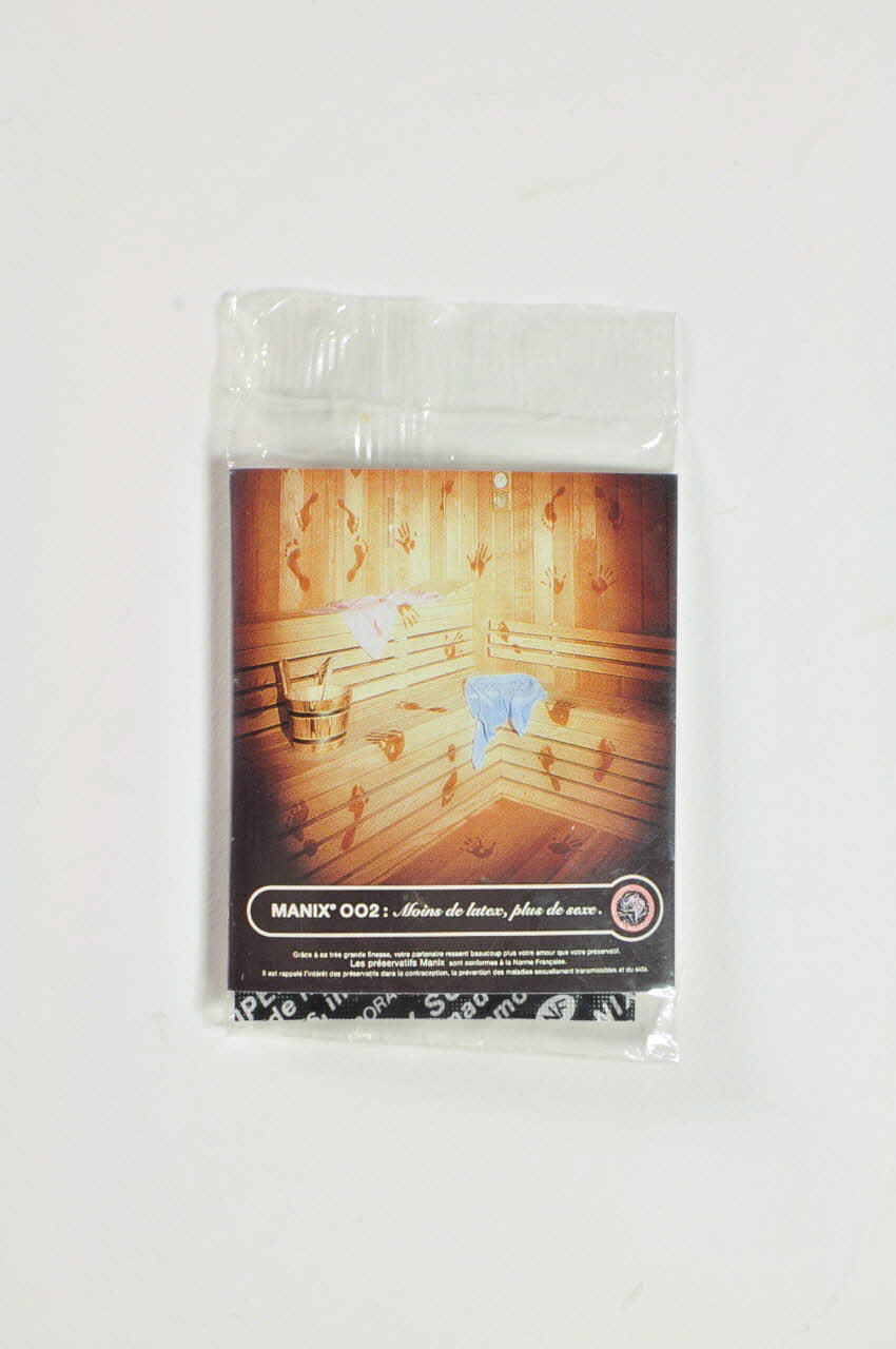 Recto."Grâce à sa très grande finesse, votre partenaire ressent beaucoup plus votre amour que votre préservatif " Et "Il est rappelé l'intérêt des préservatifs dans la contraception, la prévention des maladies sexuellement transmissibles et du sida" Verso. 1 préservatif Manix Super / (en bleu) : "Ce préservatif vous est offert par Manix. La marque qui mérite la préférence." (en noir) : "Une sécurité optimale : aucun lot rejeté au titre de la marque NF en 5 ans, durée de validité des préservatifs. / Une finesse exceptionnelle : parmi les plus fins et les plus résistants au monde. / Un plaisir maximum : des sensations naturelles intactes." / Laboratoire Ansell / Caractéristiques / Stockage