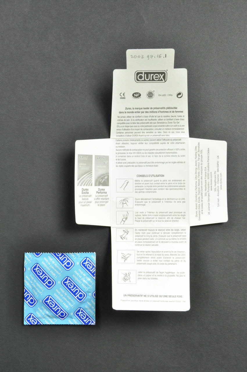 [logo] durex® / [logos] CE 0086 NF CONTROLE PAR LNE / QUALITY durex QUALITE ® / EN 600 :1996 / Durex, la marque leader de préservatifs plébiscitée / dans le monde entier par des millions d'hommes et de femmes / [...] / CONSEILS D'UTILISATION / [schémas légendés] / UN PRESERVATIF NE S'UTILISE Q'UNE SEULE FOIS. (Sur l'emballage : intérieur (en noir et blanc).), à l'intérieurDécor