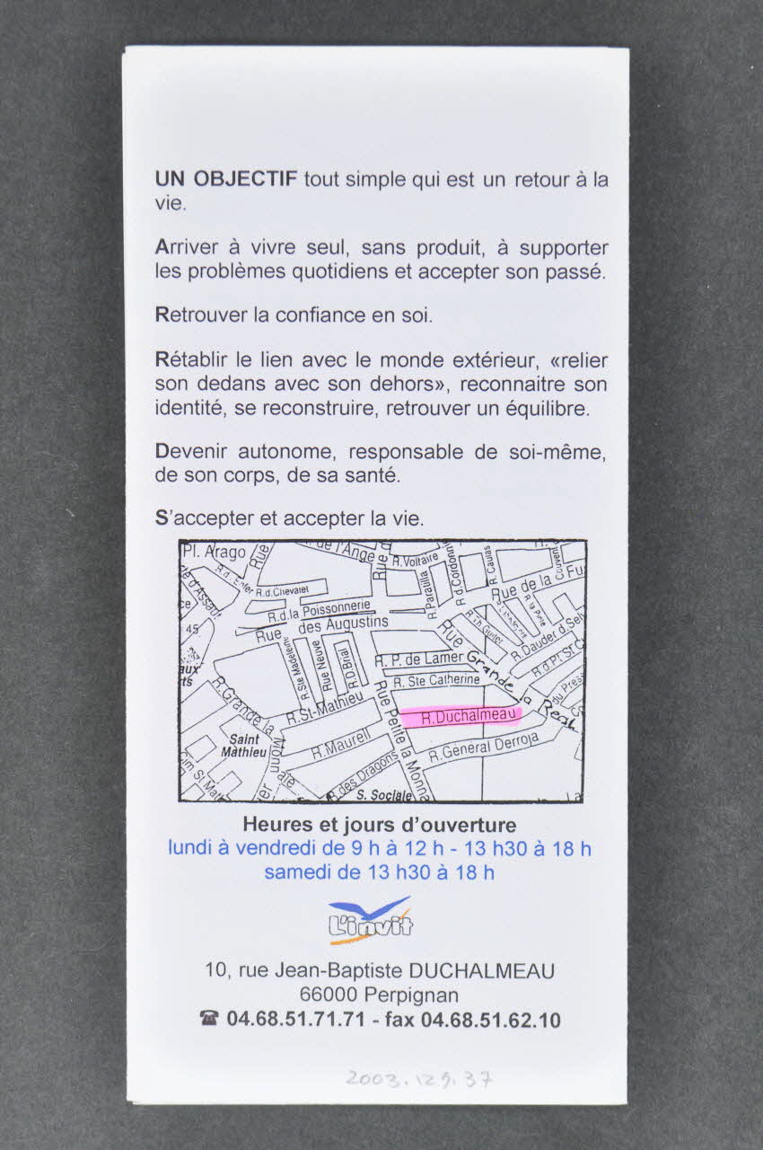 Au dos on trouve de longues inscriptions ainsi qu'un plan et les coordonnées de l'association.