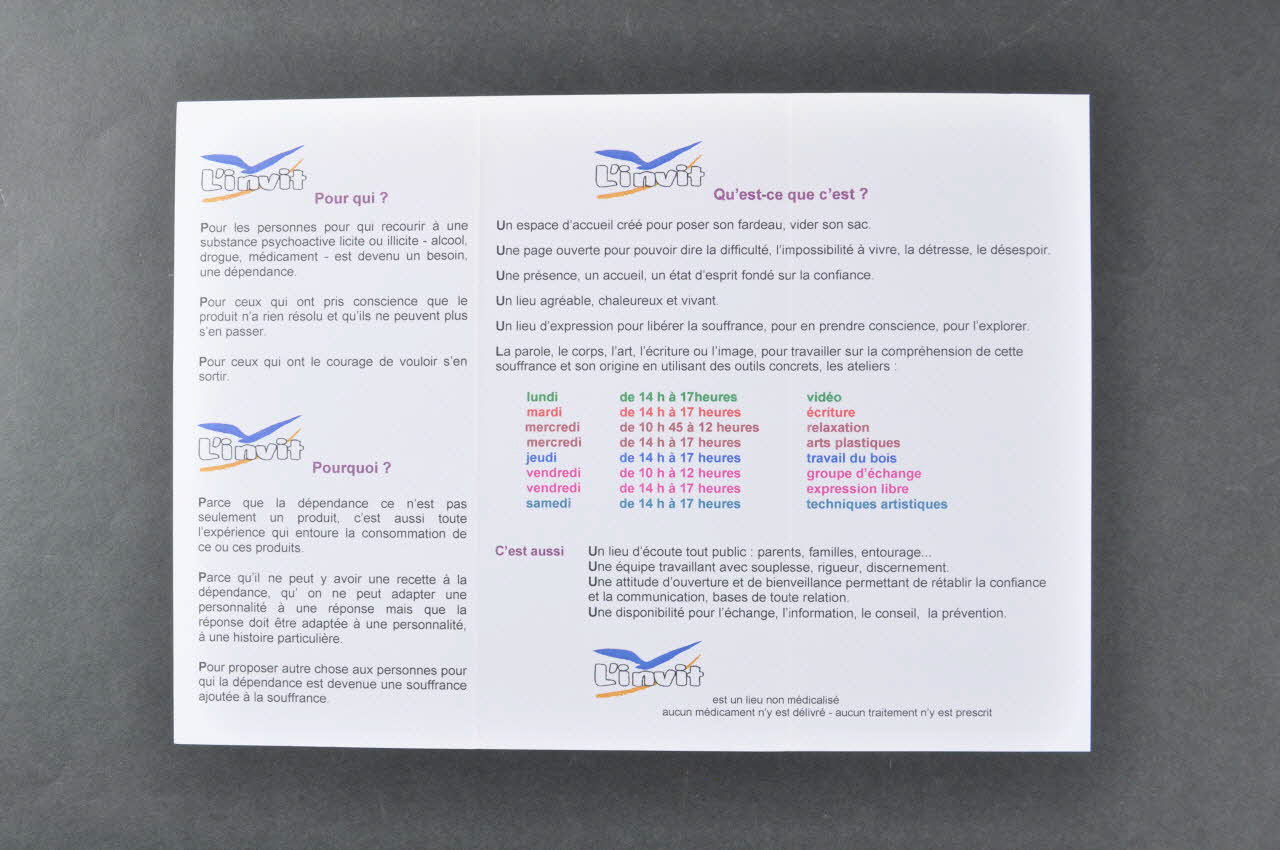 Feuillets 2 et 3. Impression sur toute la largeur des deux feuillets. L'invit, qu'est-ce que c'est ? Espace d'accueil. Ateliers de vidéo, écriture, relaxation, arts plastiques, travail du bois, groupe d'échange, expression libre, techniques artistiques. ( tableau des horaires des ateliers en lignes verte, rouge, brune, bleue, rose, bleu vert.