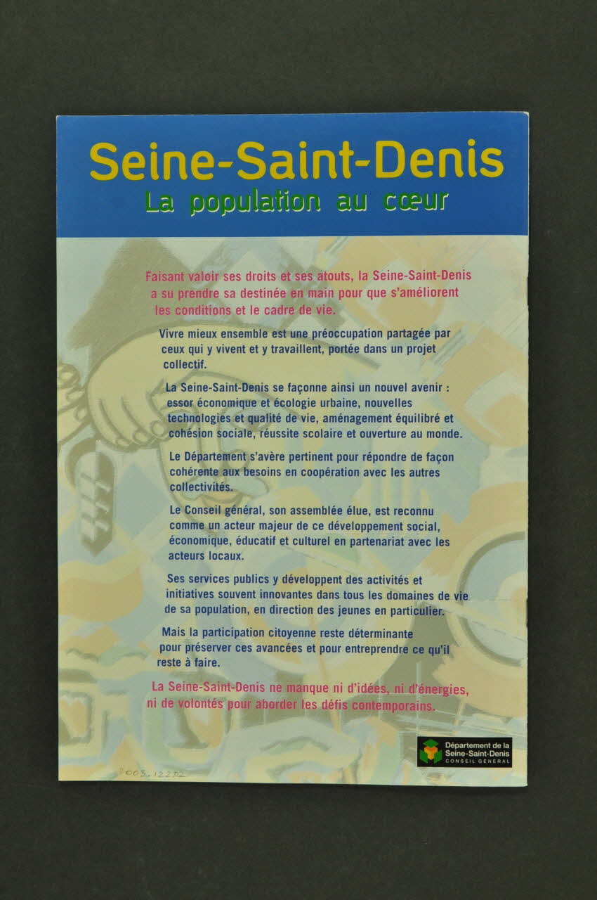 Seine-Saint-Denis // La population du coeur // // Faisant valoir ses droits et ses atouts, la Seine-Saint-Denis // a su prendre sa destinée en main pour que s'améliorent // les conditions et le cadre de vie. [...] (En quatrième de couverture, de haut en bas, imprimés en jaune et vert pour le slogan. // // Impression en rose et bleu pour les textes sous-jacents.), versoTexte