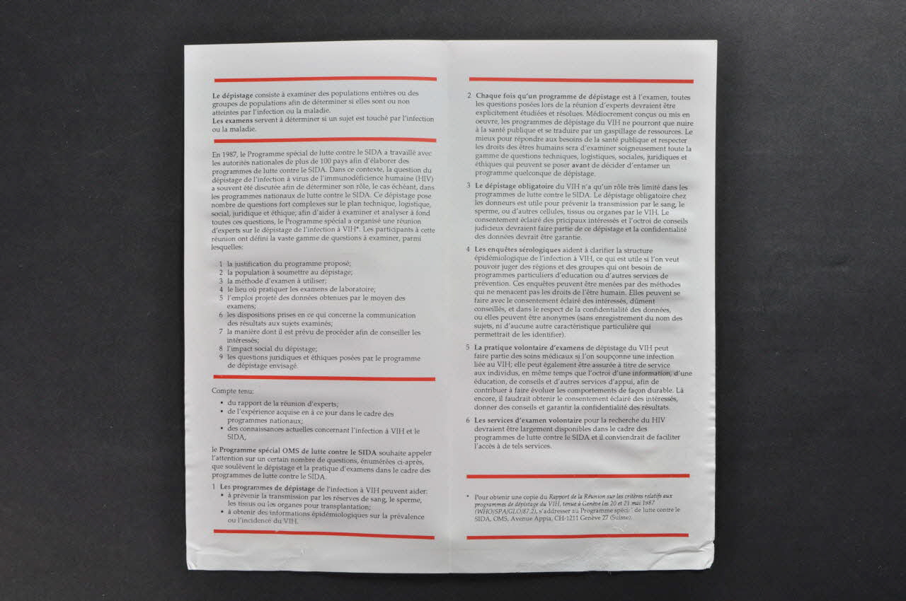 Sur la couverture à fond blanc, on trouve en haut le nom du programme, le titre et le nom de l'association ainsi que la date de parution. Chaque partie est séparée par des traits rouges. Le dos a un fond blanc et, entre les traits rouges, on trouve le logo et les coordonnées de l'OMS. A l'intérieur le texte est imprimé en noir sur un fond blanc. Des traits rouges séparent les différents paragraphes. Il s'agit des conclusions d'une réunion d'experts organisée en 1987 par le Programme de Lutte contre le Sida de l'OMS sur le dépistage de l'infection au VIH. Version anglaise en 2004.055.208Inscriptions