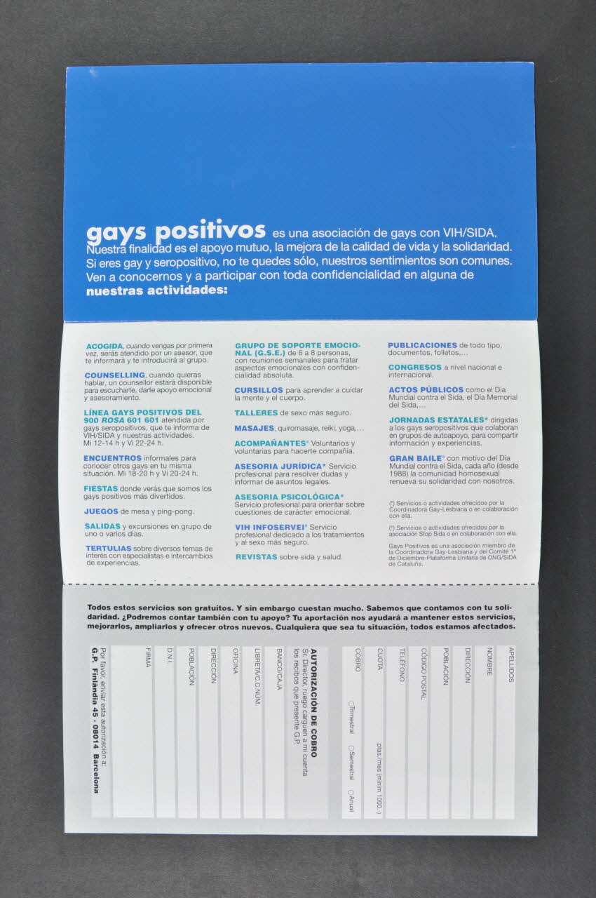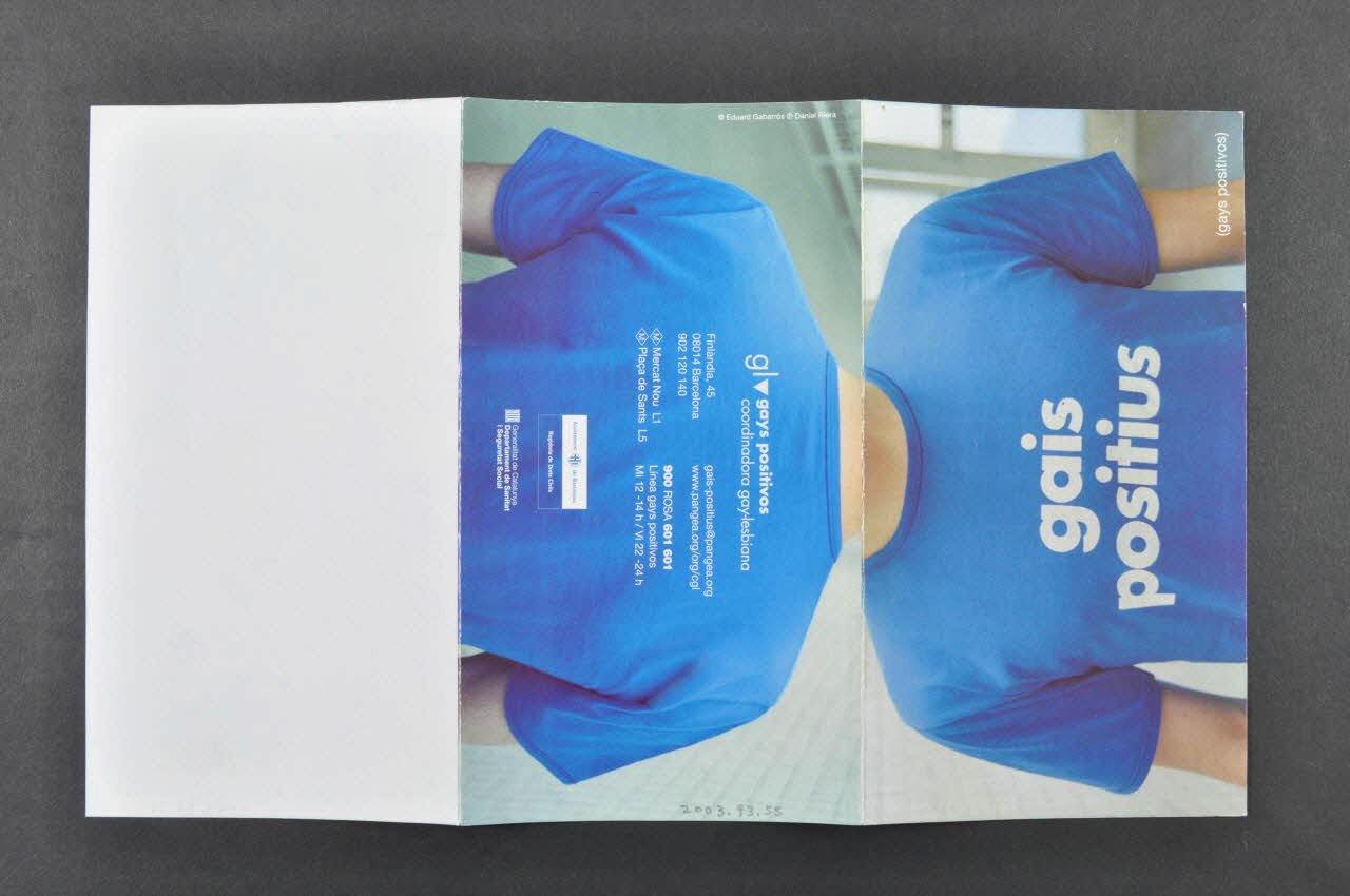 La couverture figure le haut d'un buste d'homme portant un tee-shirt bleu avec des inscriptions en blanc et la traduction en espagnol dans le coin inférieur droit de la couverture. Le dos de la couverture figure le même homme qu'en couverture mais vu de dos et où figurent coordonnées de l'association. A l'intérieur le premier volet porte des inscriptions en blanc sur fond bleu abordant les thèmes suivant être gai et séropositif, l'appui mutuel, l'amélioration de la qualité de vie, et la solidarité. Le second volet est sur fond blanc et porte des inscriptions en caractères noirs avec des titres en bleu et vert. Le dernier feuillet est un bulletin de souscription sur fond gris.Inscriptions
