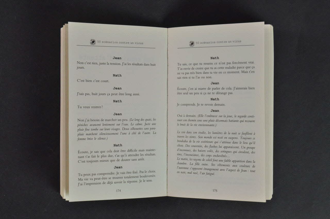 Livre à couverture souple grise avec motifs de mains en sur-impression avec titre en blanc en travers du motif et en italique : "50 scénarios contre un virus".