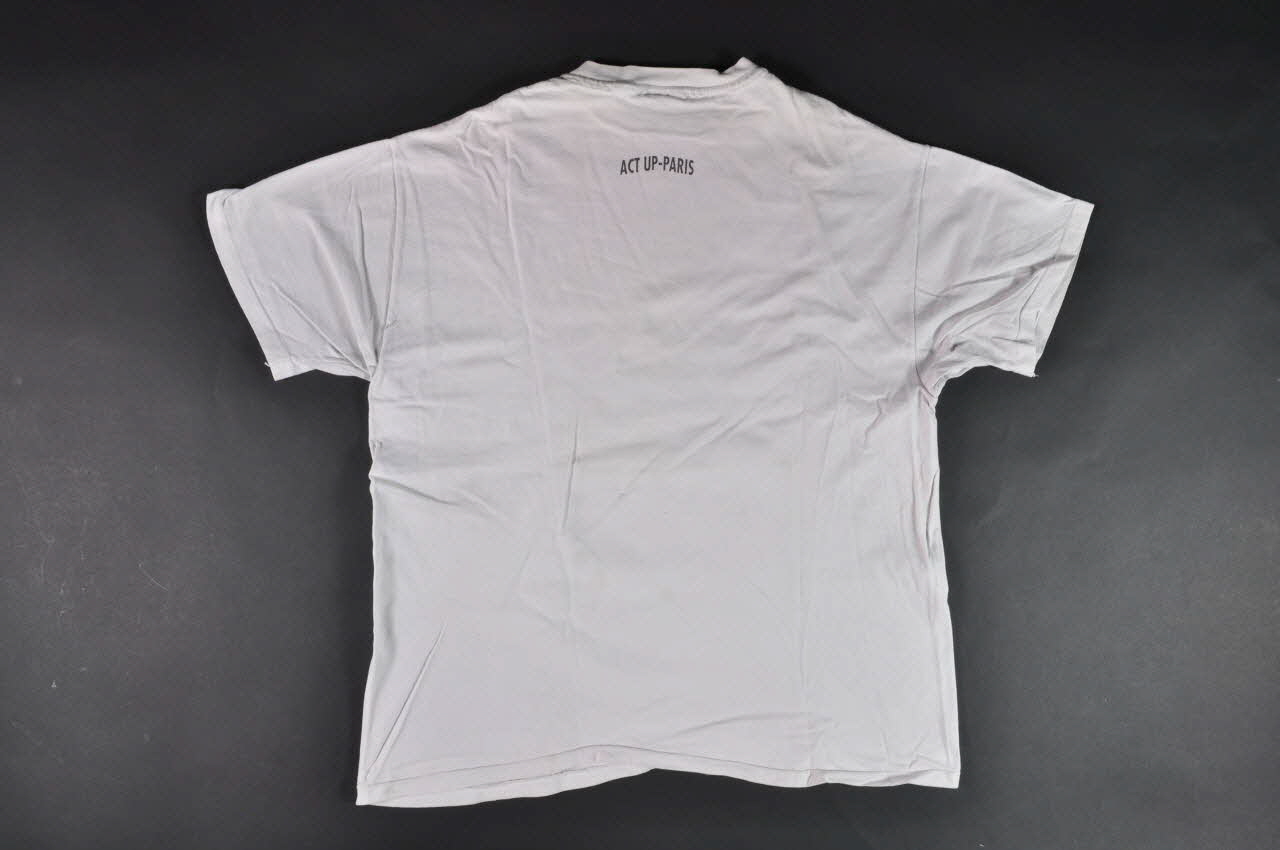 Tee-shirt usagé, porté à la manifestation par Ludovic Bouchet, militant d'Act Up qui a offert au musée ses tee shirts de militant. (Voir le livre écrite par sa mère : Joëlle BOUCHET : "J'accuse médecins et politiques" : 2002.110.85).Inscriptions
