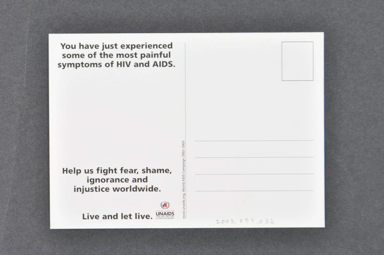 You have just experienced some of the most painful symptoms of HIV and AIDS // (Vous venez d'expérimenter certains des sympyômes les plus douloureux du VIH et du Sida) // // Help us fight fear, shame, ignorance and injustice worldwide. // // Live and let live // (Aidez-nous à combattre la peur, la honte, l'ignorance et l'injustice partout dans le monde. Vivez et laissez vivre) (à gauche), versoDécor