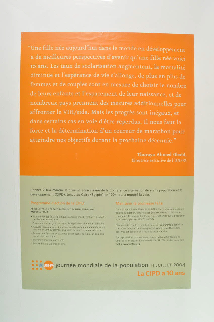 "Une fille née aujourd'hui dans le monde en développement / a de meilleures perspectives d'avenir qu'une fille née voici / 10 ans. Les taux de scolarisation augmentent, la mortalité / diminue et l'espérance de vie s'allonge, de plus en plus de / femmes et de couples sont en mesure de choisir le nombre / de leurs enfants et l'espacement de leur naissance, et de / nombreux pays prennent des mesures additionnelles pour / affronter le VIH/sida. Mais les progrès sont inégaux, et / dans certains cas en voie d'être reperdus. Il nous faut la / force et la détermination d'un coureur de marathon pour / atteindre nos objectifs durant la prochaine décennie. / Thoraya Ahmed Obaid, / Directrice exécutive de l'UNFPA, verso
