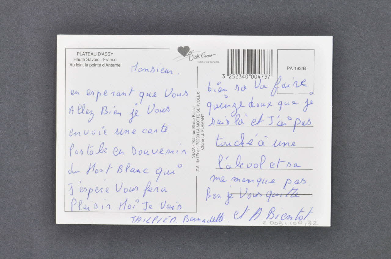 Monsieur // en espérant que Vous // Allez Bien je Vous // envoie une carte // Postale en souvenir du // Mont Blanc qui // j'espère Vous fera // Plaisir. Moi Je Vais // bien sa Va faire // quinze doux que je // suis là et J'ai pas // touché à une // l'alcool et sa // me manque pas // Bon je Vous quitte // et A Bientôt. // TAILPIER Bernadette (manuscrite), versoPLATEAU D'ASSY // Haute-Savoie-France // Au loin, la pointe d'Anterne (En haut à gauche), versoConcernant la représentation