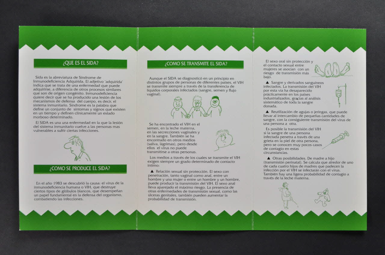 La couverture est sur fond blanc et est décoré de deux bandeaux verts se terminant en un feston et portant des inscriptions en espagnol. Au centre, sur fond blanc, figurent une série de silhouettes blanches, grises et noires. Le dos est mis en page de la même manière et figure un texte en caractères noirs en bas L'intérieur reprend une mise en page similaire avec des illustrations en vert et des titres de chapitre en blanc sur petits bandeaux verts introduisant à des textes en caractères noirs. Ils abordent les thémes suivants : - Qu'est-ce que le sida ? - Comment se transmet le sida ? - Différence entre VIH et sidaInscriptions