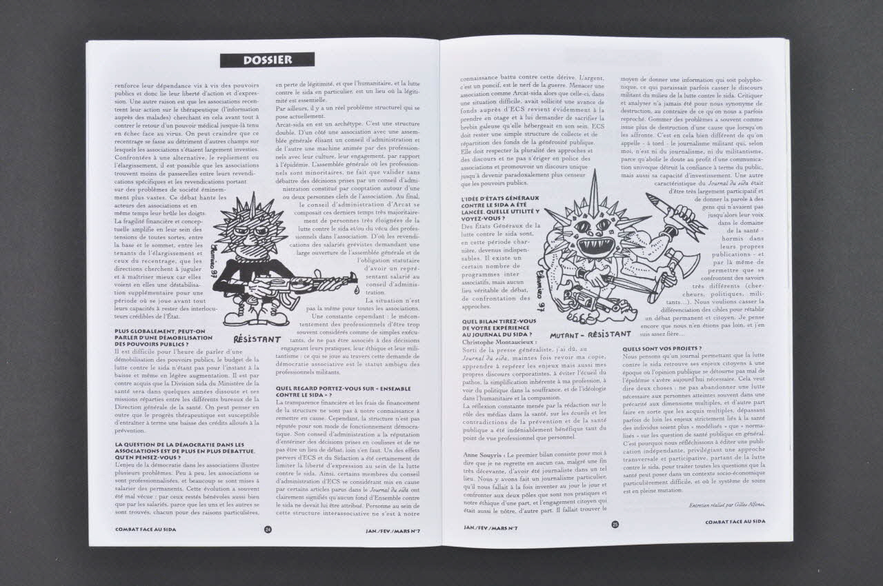 Résumé: p. 4-6 Entretien avec Hervé Gaymard, Secrétaire d'Etat à la Santé et à la Protection sociale p. 8-9 Actualités (...) (critique du tee-shirt d'Act Up six millions de morts, ambiguité car nombre estimé de juifs victimes de l'holocauste) p. 10 Revue de presse p. 11 G.A Consultation (sur les nouveaux enjeux de lutte contre le sida organisée par l'ACCS) p.12-13 Frédéric Chasseloup de Châtillon et Yannick Le Lec, Timides avancées du Parti communiste p. 14-15 Antoine Lion, Jour du Seigneur et journée mondiale du sida (texte publié dans la lettre interne des évêques de France; rôle des chrétiens, symbolique ds rites, enjeu de justice, service des souffrants p. 16-19 Frédéric Chasseloup de Châtillon, portrait : Martine, combative et exigeante p. 20-21 Gilles Alfonsi, Lutte contre le sida : quel second souffle? (tournant thérapeutique appelle une mutation du discours associatif; nouveaux enjeux : solidarité internationale, prévention, vaccin) p. 22-26 Dossier : Conflit social et enjeux actuels de la lutte contre le sida - Entretien avec Anne Souyris et Christophe Montaucieux (conflit et grève des salariés d'Arcat, crise associative, problèmes du sidaction, du Journal du sida) - Gilles-Olivier Silvagny, ancien président de Solidarité Plus, Illusions ou révolution p. 27-9 Richard Salicru, Le sida, symptôme du sens (la psychanalyse à l'épreuve du sida) p. 30-32 Agnès Deurveilher, L'absence du rêve (Petite déception devant la série de courts métrages du concours L'amour est à réinventer lancé par la Lesbian and Gay pride films) p. 32 Appel des réalisateurs contre la loi Debré p. 33-4 Xavier Aknine, Retour de Ho Chi Minh-Ville (l'épidémie au Vietnam)