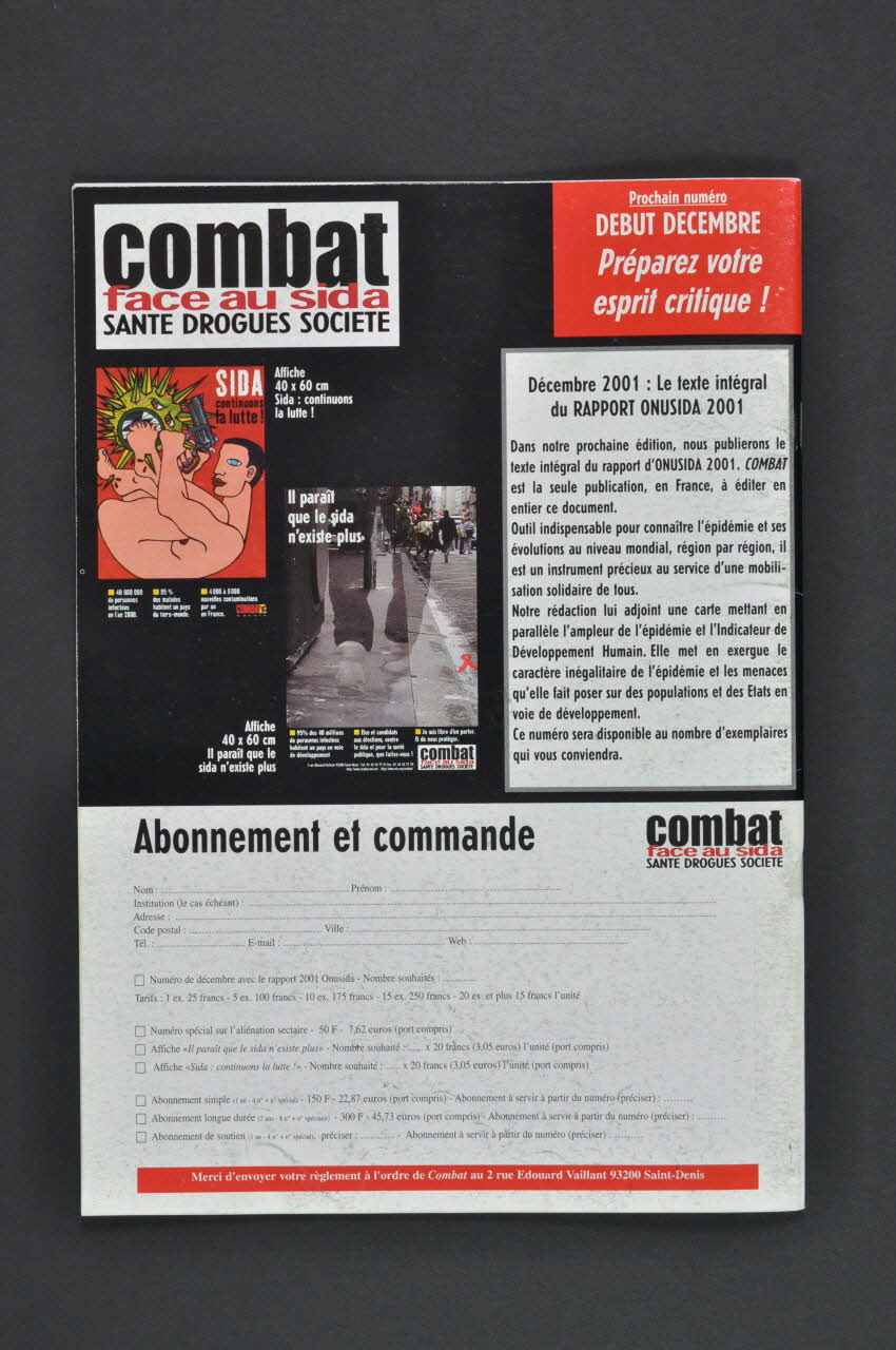 combat // face au sida // SANTE DROGUES SOCIETE (angle supérieur gauche, nom de la revue), en hautTitre