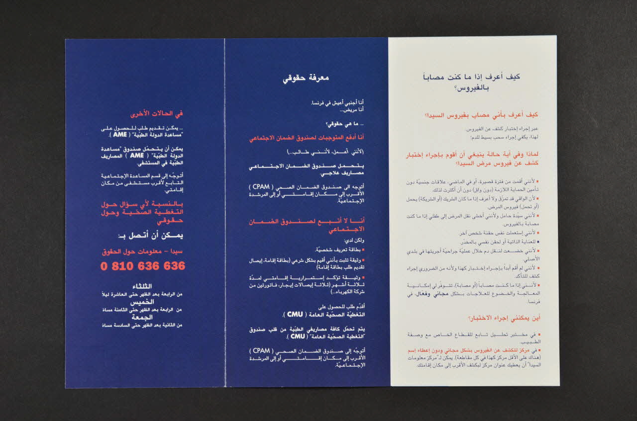 Version en français d'un dépliant également en espagnol (2003.104.04), en anglais (2003.104.05), en français (2003.104.07). / Résumé. Feuillet 1. Savoir si je suis atteint par le virus : Dans quel cas faire le test de dépistage ? / Où faire le test ? Feuillet 2 et 3. Connaître mes droits (sécurité sociale, Couverture Maladie Universelle ou Aide Médicale d'Etat). Feuillet 4. Me soigner. Pourquoi me soigner ? (traitements efficaces et gratuits) / Comment me soigner ?