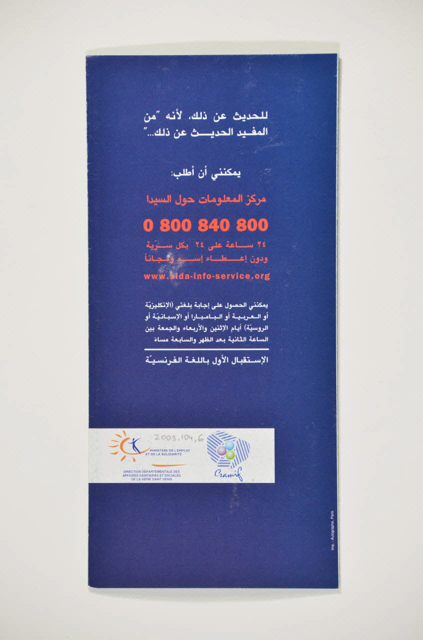 La couverture se compose de la photographie couleur sur fond bleu d'une tête vue de profil. La personne tient le combiné d'un téléphone gris à son oreille. Dans la partie supérieure, le slogan est inscrit en grandes capitales blanches. Sur la nuque de la personne, six langues sont mentionnées en petits caractères blancs: arabe, russe, bambara, anglais, espagnol. Le logo de Sida Info Service est en sur-impression, dans son rectangle blanc, sur la main: un ruban rouge, des lettres noires et des chiffres verts. Dans la partie inférieure, un texte est présent en caractères blancs italiques. Au verso, se présente sur fond bleu en caractères blancs un texte et en caractères rouges les contacts de Sida Info Service au centre. Dans la partie inférieure, il y a les logos des partenaires sur un bandeau blanc: la Cramif, trois bulles violette, bleue et vertes entourées de hachures bleues; le Ministère de l'Emploi et de la Solidarité, une silhouette humaine bleue dans un demi-soleil orange. Les volets un et quatre ont un fond blanc avec un sous-titre en capitales bleues, trois sous-titres en capitales rouges et le texte en bleu. Les volet deux et trois ont un fond bleu avec un sous-titre en capitales blanches, des sous-titres en capitales rouges et le texte en blanc.Inscriptions