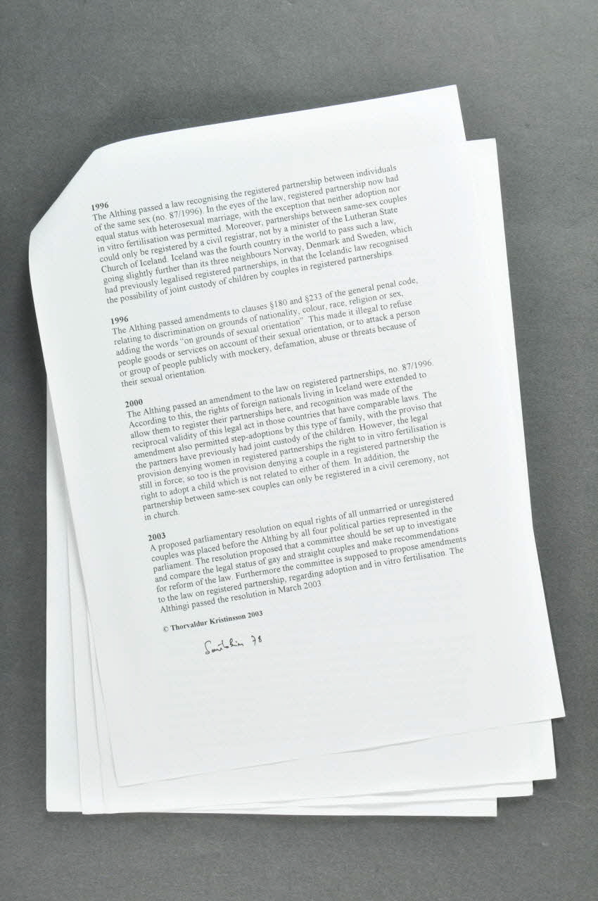 - 1978 création de l'association Samtokin 78. Les changements de la société à l'égard de l'homosexualité. - 1996 Premier pays au monde a avoir légalisé la garde commune d'enfants élevés par des partenaires de même sexe