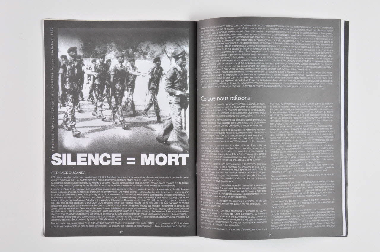 Précisions sur le contenu : - Editorial ( sur fond noir) : "Retour au silence" (depuis l'arrivée des multithérapies) - PaCS : du droit à la politique / Trahisons socialistes / Observatoire du PACS / Proposition de loi relative au PACS - L'infection côtée cher (stratégies commerciales des laboratoires / désinformation par rapport aux essais thérapeutiques) - Le goût de la parole : Réunion Publique d'Information sur la douleur. Nécessité d'en parler. Importance des témoignages. - VIH + VHC cohabitation délicate - Schering Plough profite à mort (profit sur les usagers de drogues avec le subutex) Au centre. Encart sur pages jaunes, impression en noir et en brun. "Action = vie. Bulletin d'information sociale pour les personnes atteintes par le VIH. Numéro 23. En dessous, titre de l'encart :"Les droits des patients (II) : L'hôpital ne joue pas son rôle social / Le rapport Boulard sur la Couverture Médicale Universelle / Le comité d'éthique et le consentement éclairé / L'Allocation Adulte Handicapé devient un luxe. - Plaisir des drogues, épreuve imposée aux institutions - L'épidémie au Burkina-Faso - Page avec 4 photos noir et blanc : "idéologies criminelles inertie" Photos de James D. Wolfensohn, World Bank / Jacques Sauter, Commission Européenne / Peter Piot UNAIDS / Harlem Brundtland, OMS. Et, en dessous :"Sida : 30 millions de séropositifs. Accès aux soins et aux traitements" - Sur fond noir : "Silence = Mort" . Article sur l'Ouganda. - Les minimas sociaux, même en prison - Cancer du col de l'uterus - Pages de publicité pour des clubs et des lignes minitel homosexuelles - Dernière page : fond noir. En blanc, en gros caractères :"Ignorance is your enemy". En dessous, photo d'imagerie médicale en noir et blanc. En dessous, à gauche : "Les publications d'Act Up-Paris