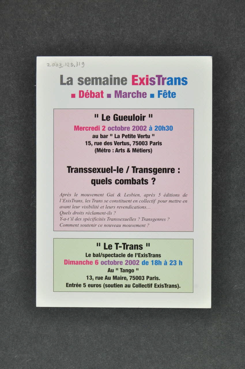 La semaine ExisTrans // Débat Marche Fête (en haut), versoDroit au respect. Respect de nos droits ! (en haut), rectoTitre