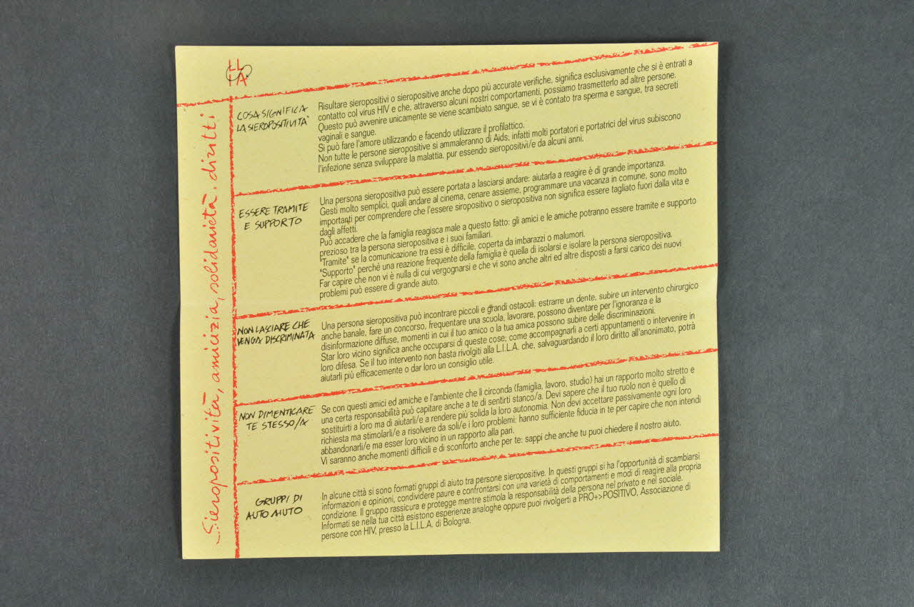 Dépliant, "Sieropositivita, almicizia, solidarieta, diritti" (Séropositivité, amitié, solidarité et droits)