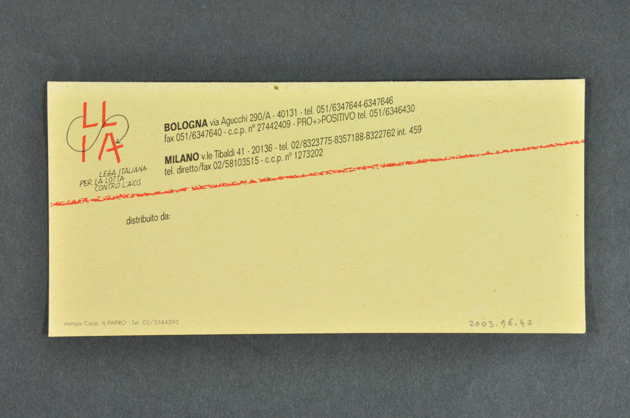LL // IA // LEGA ITALIANA // PER LA LOTTA // CONTRO L'AIDS (En rouge et noir dans le coin supérieur gauche. Et dans le coin supérieur gauche du verso.), sur la couvertureDécor