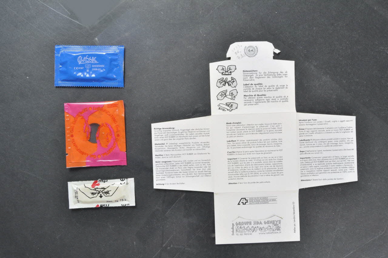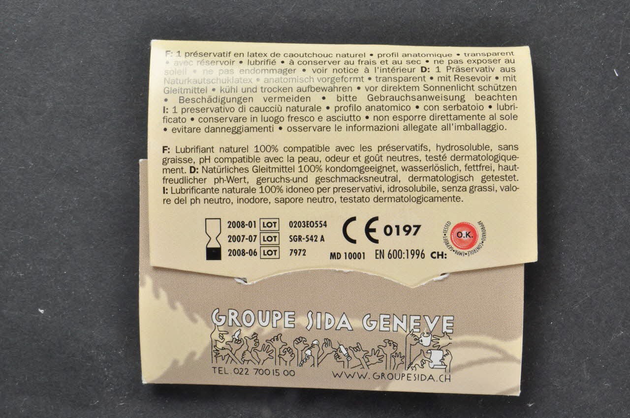 Devant : fond brun encadré de brun plus clair. Au centre, cercle jaune. Dans ce centre, deux autruches dont l'une s'enfouit la tête dans le sable. Elles dialoguent avec des bulles style BD. La première (tête dressée) : "je suis séropositive... / Et le préservatif ?". La deuxième (tête enfouie) :"Pas la peine. dans notre milieu, nous n'avons pas le sida !" Au dos, en noir sur fond crème : description du préservatif en français, allemand et italien et, en bas, logo du Groupe Sida Genève. A l'intérieur : instructions d'usage en français, allemand, italien et 4 petits schémas. Logos de Aide Suisse Contre le sida et Groupe sida Genève. Rabats intérieurs : - d'un côté, en français : spécification des tailles des préservatif (175/51 et 180/52 mm) et "d'autres tailles sont disponibles dans le commerce." - de l'autre côté : "Ne laissons pas porter aux seuls séropositifs le poids du VIH/Sida" (slogan de la campagne) Dans enveloppe rectangulaire devant bleu métallisé et dos blanc, préservatif "Hot Rubber Classic" Dans enveloppe rectangulaire plus petite. devant mordoré jaune et vert, inscription blanche "Cosano" et orange : Migros. Dos blanc : RFSU, schéma d'ouverture et encoche pour la faciliter. Dans enveloppe carrée rose et orange : "gel lubrifiant". Conseils d'utilisation au dos.Inscriptions