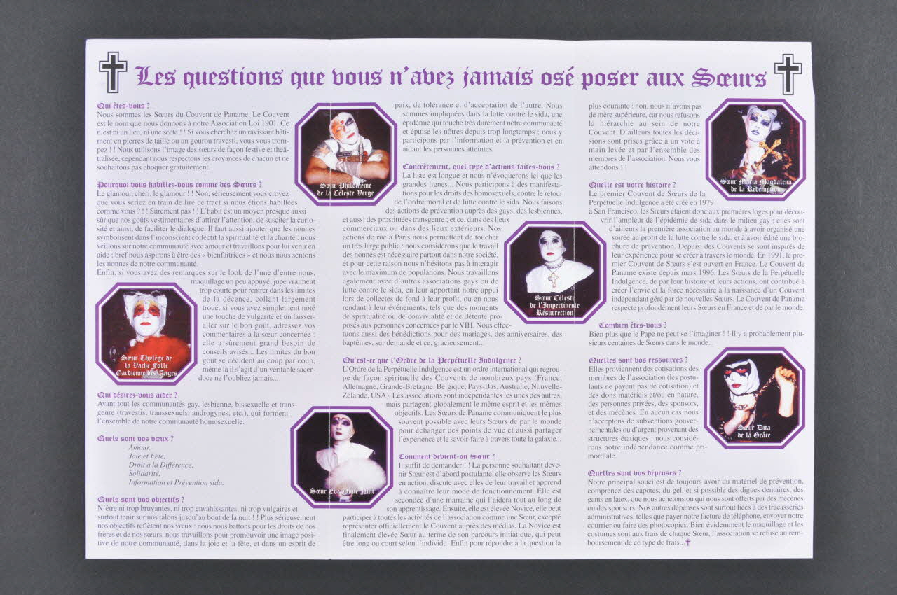 - Qui êtes-vous ? // [...] // Nous utilisons l'image des soeurs de façon festive et théâtrale, cependant nous respectons les croyances de chacun et ne souhaitons pas choquer gratuitement. // // - Pourquoi vous habillez-vous comme des soeurs ? // [...] // L'habit est un moyen presque aussi sûr que nos goûts vestimentaires d'attirer l'attention, de susciter la curiosité et ainsi, de faciliter le dialogue. Il faut aussi ajouter que les nonnes symbolisent dans l'inconscient collectif la spiritualité et la charité : nous veillons sur notre communauté avec amour et travaillons pour lui venir en aide ; bref, nous aspirons à être des "bienfaitrices" et nous nous sentons les nonnes de notre communauté. // [...] // // - Qui désirez-vous aider ? // Avant tout les communautés gay, lesbienne, bisexuelle et transgenre. // [...] // // - Quels sont vos voeux ? // Amour / Joie et Fête / Droit à la Différence / Solidarité / Information et Prévention sida" // // - Quels sont vos objectifs ? // [...] // Nous nous battons pour les droits de nos frères et de nos soeurs, nous travaillons pour promouvoir une image positive de notre communauté, dans la joie et la fête et dans un esprit de paix, de tolérance et d'acceptation de l'autre. Nous sommes impliquées dans la lutte contre le sida, une épidémie qui touche très durement notre communauté et épuise les nôtres depuis trop longtemps ; nous y participons par l'information et la prévention et en aidant les personnes atteintes. // // - Concrètement, quel type d'actions faites-vous ? // [...] // Nous participons à des manifestations pour les droits des homosexuels, contre le retour de l'ordre moral et de lutte contre le sida. Nous faisons des actions de prévention auprès des gays, des lesbiennes et aussi des prostituées transgenre , et ce, dans des lieux commerciaux ou dans des lieux extérieurs [...] Nous n'hésitons pas à interagir avec le maximum de populations. Nous travaillons également avec d'autres associations gays ou de lutte contre le sida en leur apportant notre appui lors de collectes de fonds à leur profit, ou en nous rendant à leurs évènements, tels que des moments de spiritualité ou de convivialité et de détente proposés aux personnes concernées par le VIH. Nous effectuons aussi des bénédictions pour des mariages, des anniversaires, des baptêmes, sur demande, et ce, gracieusement... // // - Qu'est-ce que l'Ordre de la Perpétuelle Indulgence ? [...] // // - Comment devient-on soeur ? [...] // // - Quelle est votre histoire ? [...] // // - Combien êtes vous ? [...] // // - Quelles sont vos ressources ? // [...] En aucun cas nous n'acceptons de subventions gouvernementales ou d'argent provenant des structures étatiques : nous considérons notre indépendance comme primordiale // // - Quelles sont vos dépenses ? // Notre principal souci est de toujours avoir du matériel de prévention... que nous achetons ou qui nous sont offerts par des mécènes ou des sponsors [...] Bien évidemment, le maquillage et les costumes sont aux frais de chaque soeur, l'association se refuse au remboursement de ce type de frais... (Imprimé en noir ou violet (pour les titres des parties) sur fond parme très clair), à l'intérieur