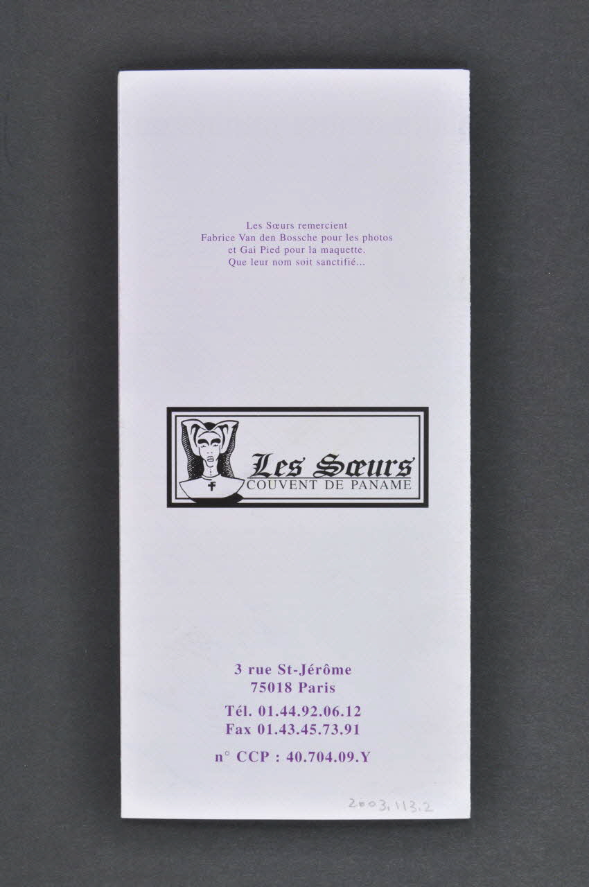 Les soeurs remercient // Fabrice Van den Bossche pour les photos // et Gai Pied pour la maquette. // Que leur nom soit sanctifié (Imprimé en petits caractères violets, dans la partie supérieure), verso