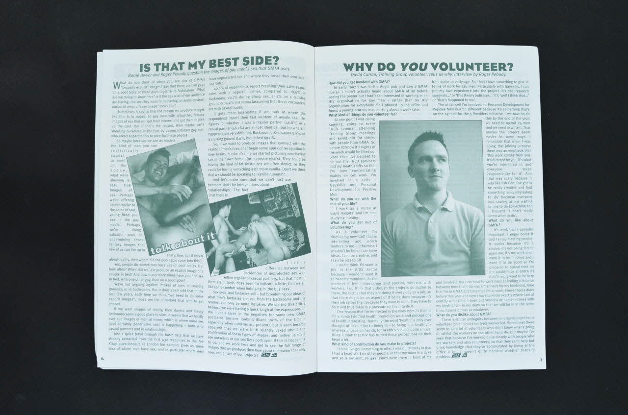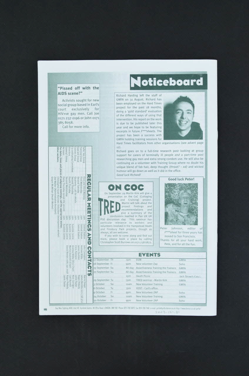 He did it his way 3 // What do we do now 4 // Is that my best side 6 // Why do you volunteer 7 // Microcommunities 8 // Brighton after Zorro 10 // Why do gay men think that // becoming +ve is inevitable 11 // They live by night 12 // More like a village fete 13 // Safer Sex - CHAPS 14 // News in brief 15 // Dish of the day 16 (Dans une colonne verte sur la droite de la page 2, en haut), à l'intérieurTitre
