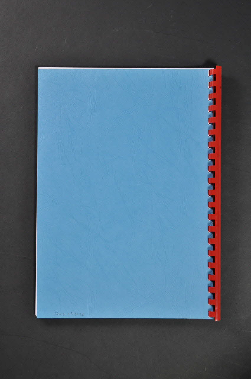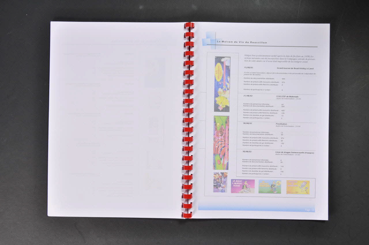 Ce rapport en français est constitué de trente-cinq pages blanches imprimées en couleur et assemblées par une reliure en plastique rouge dans une couverture cartonnée plus épaisse.