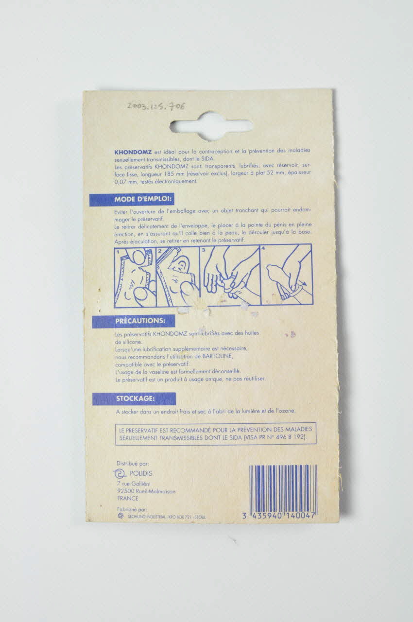 "Khondomz est idéal pour la contraception et la prévention des maladies sexuellement transmissibles, dont le sida" : Caractéristiques / Mode d'emploi et 4 schémas / Précautions : "Les préservatifs Khondomz sont lubrifiés avec des huiles de silicone. Lorsqu'une lubrification supplémentaire est nécessaire, nous recommandons l'usage de Bartoline compatible avec le préservatif. L'usage de la vaseline est formellement déconseillé. Le préservatif est un produit à usage unique, ne pas réutiliser." / Stockage / "Le préservatif est recommandé pour la prévention des maladies sexuellement transmissibles dont le sida" / fabriqué en Corée. Distribué par Polidis