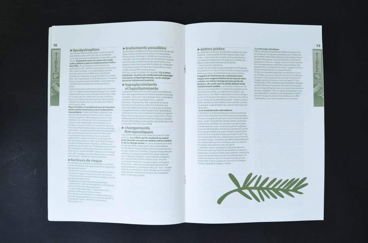 Bulletin imprimé en vert. Titre du bulletin : "Protocoles" et date et n° disposés verticalement. Le n° "19" en sous impression sur la première page. - p. 1 Edito : (...) "Concernant l'accès précoce aux nouvelles molécules pour les personnes en échappement, cela fait de longs mois que nous présentons les molécules qui devraient arriver sur le marché français. Ces molécules présentent une réelle chance de survie pour les personnes lourdement prétraitées et en échappement. Et pourtant. les laboratoires nous montrent une fois de plus leur cynisme en ne mettant pas tout en oeuvre pour permettre l'accès précoce à ces médicaments" (T20/Roche; Adéfovir/Gilead) - Grille de lecture des essais thérapeutiques en cours ou à venir (tableau par critères : naïfs, pré-traités, charge virale, nombre de CD4, infections opportunistes, bénéfice direct) - p. 2 Les médias d'Act Up-Paris (publications, Internet, réunions) - p. 3 Repères : conseils avant d'entrer dans un essai : réfléchir, importance de l'adhésion au traitement et donc de connaître avant effets secondaires et contraintes, demander une photocopie des bilans , demander la communication des résultats de l'essai; au préalable. Questions à éclaircir : l'essai prévoit-il des actes invasifs? Les examens nécessitent-ils d'être à jeun? en cas de prélèvements de sang importants serai-je prévenu au préalable? en cas d'effets secondaires dûs à l'essai, des traitements sont-ils prévus. Remboursement de frais et bonnes conditions de soins prévus? -p. 4 Description des essais ou études : à qui s'adresse, commentaire, objectif, critères pour y entrer, critères d'exclusion, déroulement de l'étude ou essai : - Etude 1182.6 (Voehringer ingelheim) (association Tripanavir / Ritonavir) - p. 5-10 Effets secondaires statu quo (Journée de réflexion organisée par TRT5 sur les effets indésirables et la pharmacovigilance : troubles graisseux et troubles du métabolisme; troubles osseux; troubles sexuels; pharmaco vigilance, essais de phase IV) - p. 11-13 Cannes, 4ème conférence internationale sur la nutrition dans le cadre de l'infection VIH et 2ème atelier européen sur les lipodistrophies (perte de poids, lipodistrophies, favteurs de risque, traitements possibles) - p. 14-16 Y a-t-il un pilote dans l'avion ?( à propos des lipoatrophies: "stigmates de la maladie VIH" : comment redonner leurs visages aux séropos et à quel prix (trois types de produits : les non-résorbables ; les résorbables; les semi résorbables; combien cela coûte, quel remboursement? - p. 17-18 AMP enfin possible (zap phone fax contre le cabinet du ministère, la DGS, la Direction des hôpitaux; victoire : arrêté permettant aux couples sérodifférents (homme ou femme séropositif(ve)d'accéder à l'assistance médicale à la procréation p. 19 Tableau avec Traitement et dosage; Effets secondaires; associations contre-indiquées et déconseillées, recommandations - p. 20-21 Brèves (antioxydants et troubles neurologiques; volontaires pour un vaccin; exclusion d'une personne d'un protocole par Roche; essai Arda : anesthésie locale et non générale; amincissements osseux; étude ANRS sur la prévention de la transmission ; périnatale, tatouage et multithérapie : syndrome de la restauration immunitaire; interruption de traitement '"Une personne séropositive peut être contaminante quelque soit son niveau de charge virale plasmatique"); changements mensuels : association de médicaments un mois et autre association autre mois -p. 22-3 Glossaire