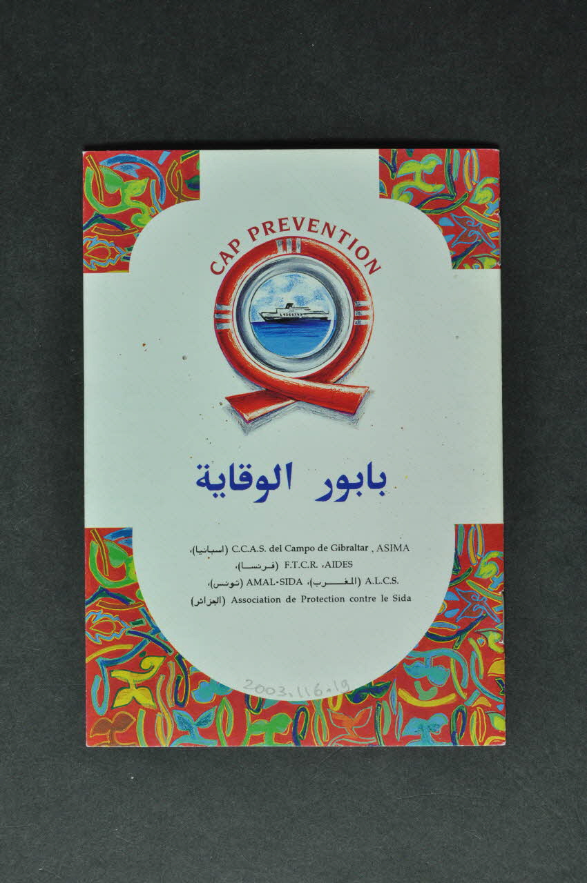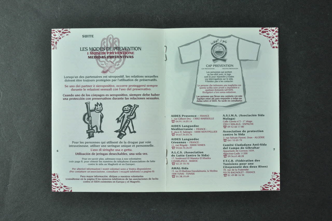 Brochure distribuée sur les bateaux au départ d'Oran, de Tanger, de Marseille de Sète et d'Algésiras. Distribution faite par des volontaires avec tee-shirt portant le logo et prêts à répondre aux questions. Il s'agit d'une action interassociative réalisée par deux associations espagnoles (ASIMA, Campo de Gibraltar), deux associations françaises (Aides, Fédération des Tunisiens pour une Citoyenneté des Deux Rives(FTCR) ), une association marocaine (ALCS), Une association tunisienne (Amal-Sida), une association algérienne (Association de Protection contre le Sida)