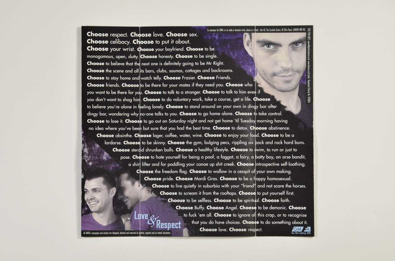 Choose respect. Choose love. Choose sex. // Choose celibacy. Choose to put it about. [...] (Imprimé en blanc sur noir), à l'intérieurNom d'association