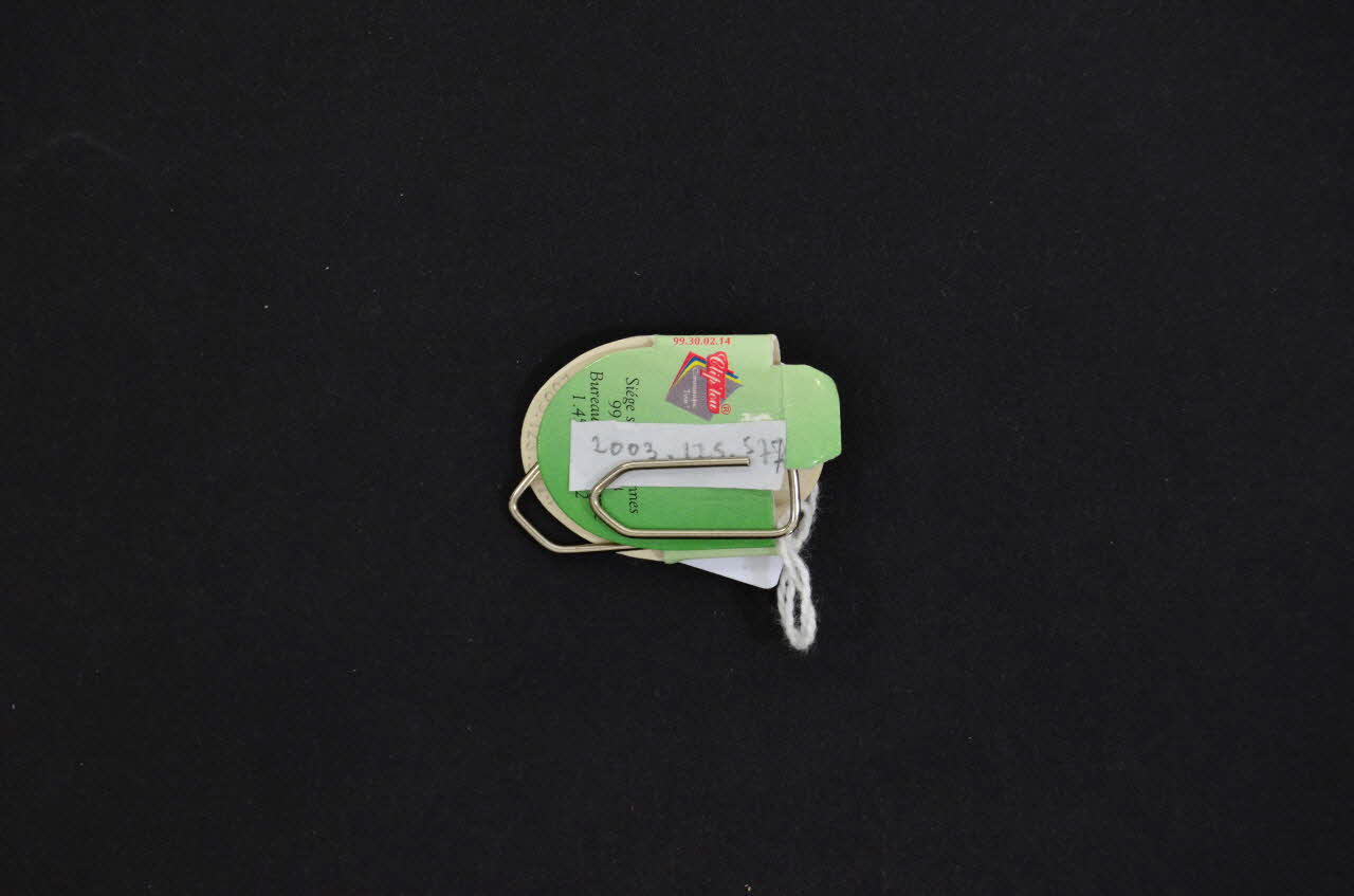 Le clip porte préservatif est composé d'un morceau de carton (.1) en forme d'écusson dont les deux rabats au dos sont maintenus fermés par un trombone en métal (.2). L'extérieur du carton présente un fond vert, un logo, une inscription blanche dans un bandeau bleu, des inscriptions noires et rouges.Décor