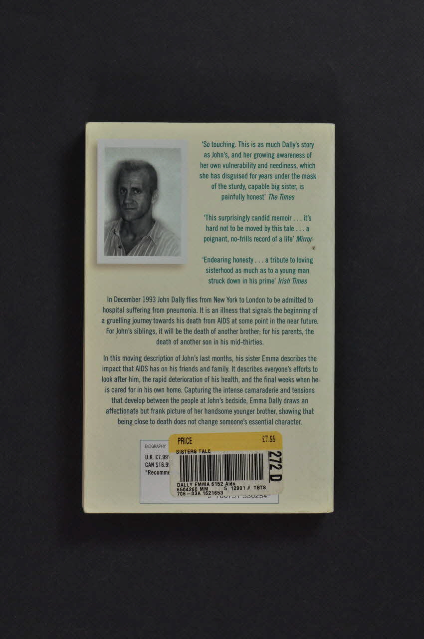 Au dos, la photo noir et blanc d'un jeune homme (John dont la soeur Emma raconte l'histoire). A côté, extraits élogieux de critiques de presse (The Times, Mirror, Irish Times) et résumé du livre (en anglais) : En décembre 1993, John Dally vole de New York à Londres pour être admis à l'hôpital car il souffre de pneumonie. C'est une maladie qui signale le début d'un voyage terrible jusqu'à sa mort du sida dans un futur proche. Pour les frères et soeurs de John, ce sera la mort d'un autre frère, pour ses parents la mort d'un autre fils au milieu de ses trente années. / Dans cette description émouvante des derniers mois de John, sa soeur Emma décrit l'impact du sida sur ses amis et sa famille. Elle décrit les efforts de chacun pour s'occuper de lui, la rapide détérioration de sa santé et les dernières somaines où il est soigné chez lui. Capturant l'intense camaraderie et les tensions qui se développent entre les personnes qui sont au chevet de John, Emma Dally trace un tableau affectionné mais franc de son charmant plus jeune frère, en montrant que la proximité de la mort ne change pas l'essentiel du caractère de quelqu'un"