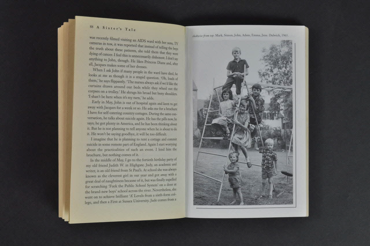 Livre rectangulaire de 214 pages à couverture souple avec, au centre, photographie noire et blanc de deux enfants : un petit garçon dans une voiture à pédale, sa soeur plus grande le tenant par la main. Sous la photo, le titre et l'auteur : "A sister's tale a family memoir. Emma Daily" (Une soeur raconte une mémoire familiale). Au dessus de la photo, extrait de commentaire par Rosie Thomas (en anglais) : "Un de ces écrits en apparence simples mais inoubliables qui ne cessent de rester dans notre mémoire".