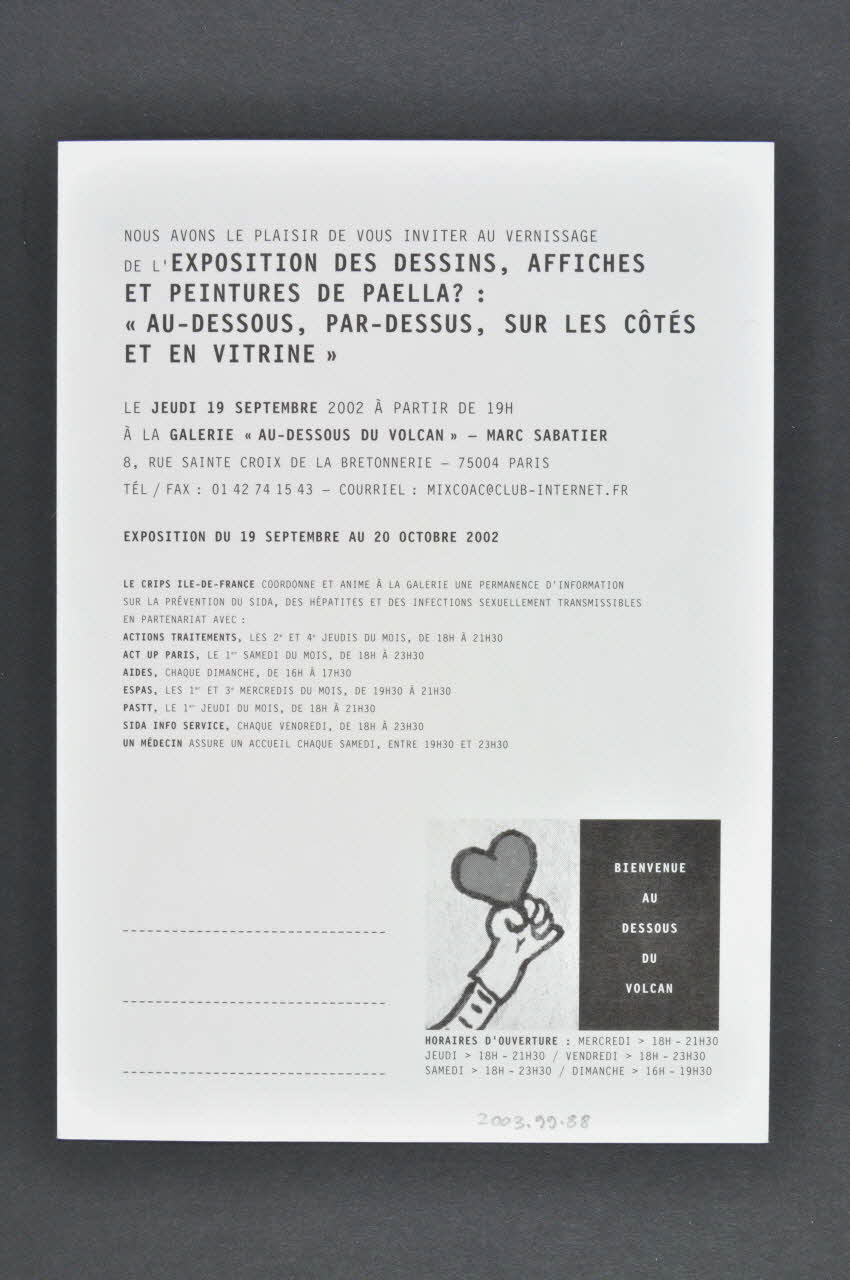 NOUS AVONS LE PLAISIR DE VOUS INVITER AU VERNISSAGE // DE L'EXPOSITION DES DESSINS, AFFICHES ET PEINTURES DE PAELLA?: // "AU-DESSOUS, PAR-DESSUS, SUR LES CÔTÉS // ET EN VITRINE" (Imprimé en noir, en lettres capitales), versoNuméro