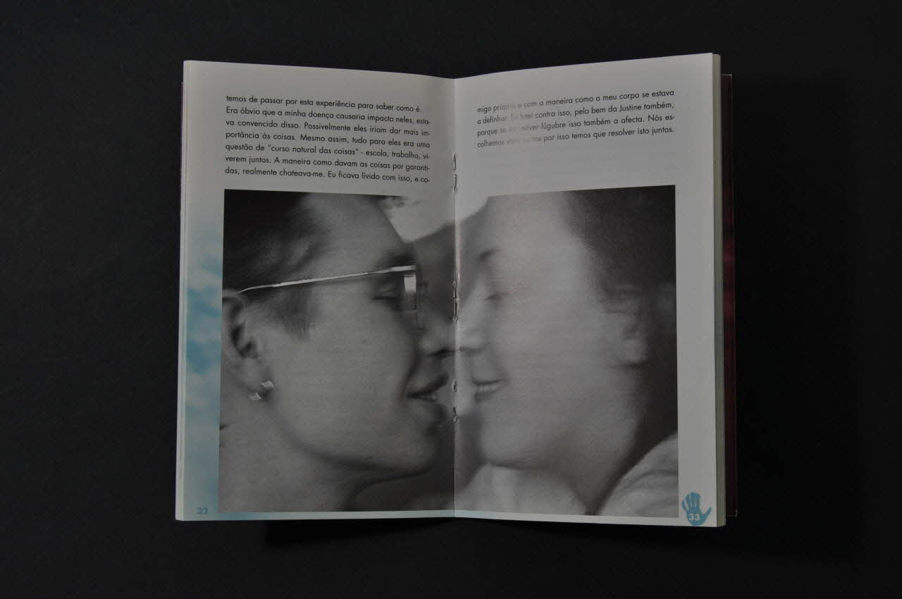 La couverture comporte un fond bleu et rose sur lequel se détache des inscriptions blanches à gauche et une inscription rose à la verticale à droite. Le dos de la brochure comporte le même fond que la couverture. Un logo figure au milieu en bas. La couverture et le dos de la brochure détiennent des rabats. L'intérieur de la brochure est constitué d'un texte noir sur fond bleu et blanc et de photographies noir et blanc représentant diverses personnes (hommes, femmes, enfants).Inscriptions