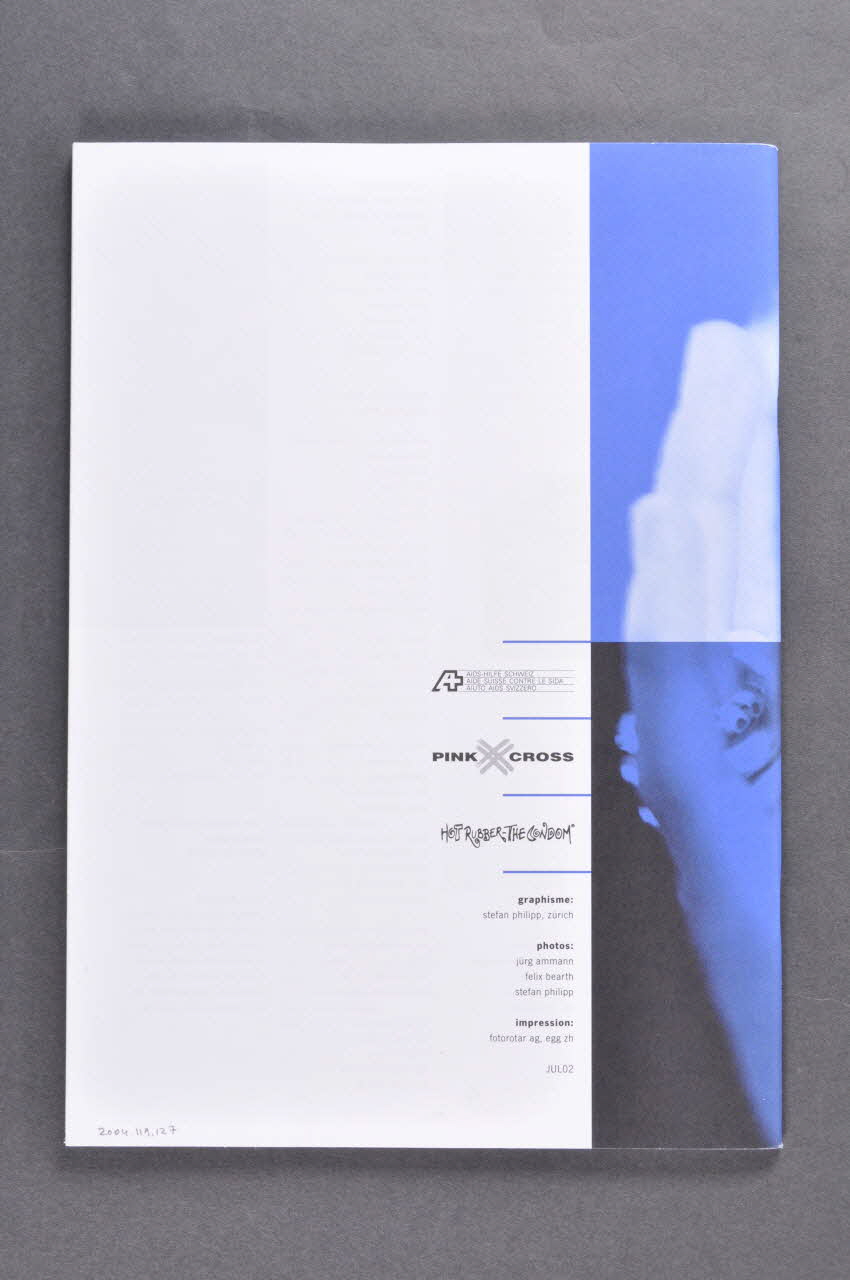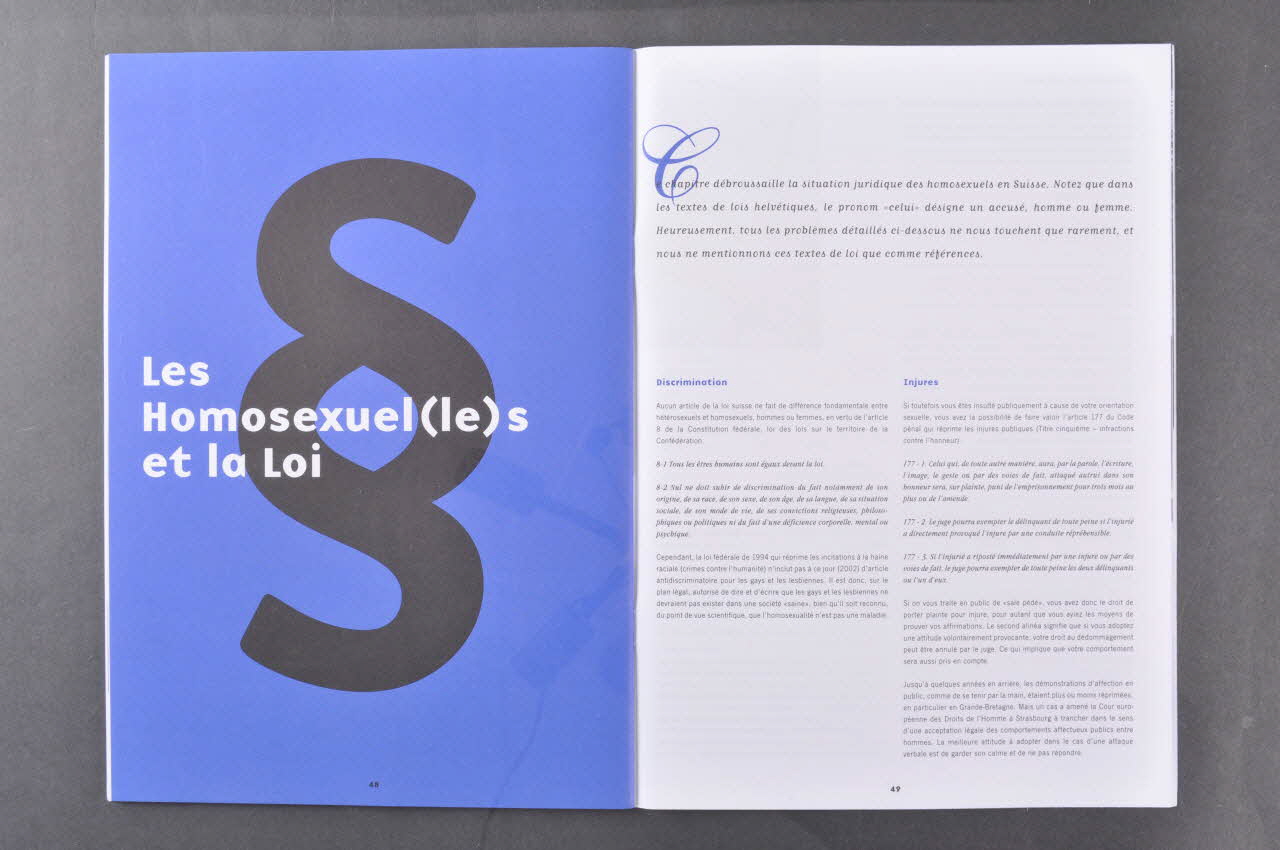 La première page, faisant office de couverture, est divisée en quatre parties formant un visage recomposé en moitié (droite) d'un visage masculin et à moitié (gauche) d'un visage féminin. Les photographies sont imprimées dans les tons bleus. Un titre figure dans le haut, en caractères blancs. En bas à droite, en biais, en noir sur bandeau blanc, se trouve une précision quant à l'édition. Le dos à fond blanc présente, à droite, un bandeau bleu. A côté, verticalement sur le fond blanc, on trouve en colonne, le logo de l'association et celui des partenaires : Pink Cross et Hot Rubber the condom. Les pages à fond blanc sont couvertes d'impressions en noir sur deux ou trois colonnes, séparées par des encarts en bleu. Les titres de parties figurent en caractères blancs sur fond bleu et les textes sont illustrés de photographies bleutées ou noir et blanc. De nombreux témoignages en italiques gras accompagnent les textes. / Sommaire - p.6 Etre soi-même (C'est quoi, être homo ? / Quelle est l'origine de l'homosexualité ? / Que veut-dire homophobie, homophobe ? / Dans la vie courante, serai-je accepté(e) ?) - p.10 Pour en parler autour de soi (A qui puis-je le dire ? / Avant de faire le pas / Vos parents / Comment et quand le dire ?/ Comment mon entourage va-t-il réagir ? / Comment mes parents vont-ils réagir ? / Le choc / La perte / Le déni / La culpabilité / Le dialogue / La prise de position / L'intégration / témoignage d'un père.) - p.18 A l'intention des parents (Questions communément posées / Des parents racontent leur histoire) - p.22 Peut-être suis-je gay (Ces sentiments qui nous habitent / L'image des gays et la réalité homosexuelle / Les gays, leur milieu, leur culture... Quelles références ? / Le "coming out" / La première fois / Le sida / Le safer sex) - p.32 Peut-être suis-je lesbienne (Comment savoir si je suis lesbienne ? / Si finalement je suis lesbienne, suis-je normale ? / Pourquoi est-on lesbienne ? / Est-ce particulièrement difficile d'être jeune et lesbienne ? / L'amour avec une femme, comment ça se passe ? / Est-ce que je risque de contracter le sida en faisant l'amour avec une femme ? / En tant que lesbienne, est-ce que j'ai un avenir ?) - p.40 Bisexuel(le)... Ca existe aussi ! (Qu'est-ce que la bisexualité ? / comment savoir si je suis bi ? / Si je suis bi, que faire ? / Comment vivre ma bisexualité ?) - p.44 Le Sida (Vecteurs, récepteurs et voies de contamination, dépistage - p.48 Les Homosexuel(le)s et la Loi (discrimination /Injures / Entretien des enfants / Contrainte sexuelle / Epidémies - p.52 Tranches de vie (Témoignages de jeunes) - p. 60 Quelques points de repère historiques - p.61 Quelques références bibliographiques - p.62 ContactsInscriptions