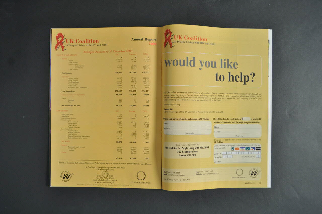 Les articles sont regroupés sur le sommaire en 3 rubriques : features (portraits) / treatments / regulars. Features : - p. 14 Des opposés s'attirent (grand titre de couverture) (témoignage d'un couple homosexuel : un acteur de Cats et son ami) - p. 18 Jeune, gay et séropositif. pourquoi ? (titre de couverture) (témoignages de jeunes insistant sur le caractère inadéquat de l'éducation sexuelle des jeunes) - p. 20 Témoignage d'un écrivain sud africain - p. 22 Témoignage d'un jeune migrant africain: en parler sans honte et ouvertement (titre de couverture) - p. 26 Article financier sur les pensions, les assurances... - p. 28 Comment survivre au mardi gras (que porter, médicaments, boissons...). Annonce de la distribution pour mardi gras de 20.000 préservatifs gratuits : "Limited edition". Char de Positive Nation au mardi gras. - p. 30 Conseils pour les vacances et les voyages - p. 32 Financement du fonds mondial (Compte rendu des débats à l'ONU) Traitements - p. 36 Nouvelles des traitements : l'hépatite C - p. 38 Santé mentale et VIH (titre de couverture) - p. 40 Quel traitement prendre en premier ? (titre de couverture) - p. 42 Ostéopathie - p. 44 Sur les effets secondaires Rubriques régulières - p. 4 Lettres de lecteurs - p. 8 Chouchoutez vous ( lunettes de soleil...) - Témoignages - p. 10 Nouvelles ( - p. 56 La page des arts - p. 65 Recette du mois p. 25 page noire et blanc émanant de Terrence Higgins Trust. En haut : photo de manifestants tenant des pancartes : "Equal Opportunity and Human Dignity". En dessous, en grandes capitales noires :" Les préjugés s'enracinent sur l'ignorance". En plus petits caractères : Comme quiconque vit avec le VIH vous le dira. En dessous, en plus petits caractères : on ne peut pas attraper le VIH, en vivant avec quelqu'un qui a le VIh, ni en travaillant avec lui ni même en s'occupant de lui. Alors, pourquoi avons-nous tant de préjugés à l'égard des personnes séropositives ? Les personnes séropositives sont toujours des personnes - des parents, des enfants, des professionnels et des membres de notre communauté - avec les mêmes droits à la dignité humaine et les mêmes chances que toute autre personne. Et comme toute autre personne, elles ont besoin de l'amour et du soutien de leur famille, de leurs amis, et de la communauté toute entière. Préjugé ? pensez-y. En bas, le logo de l'association.