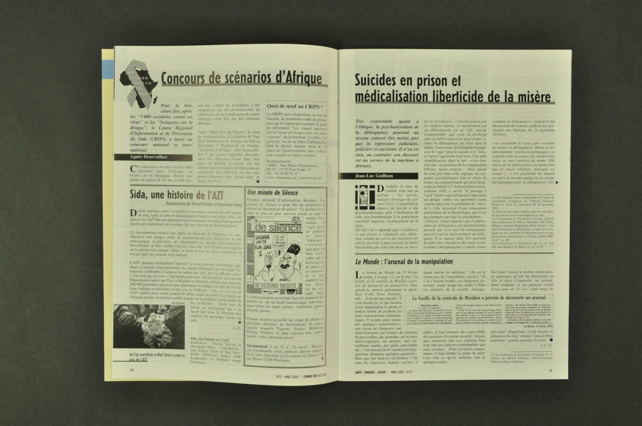 combat // face au sida // SANTE DROGUES SOCIETE // // N°31- MARS 2003 - 4 EUROS (Sur la première de couverture, dans l'angle supérieur droit, le titre et le logo sont imprimés en orange et noir. // // La date e tle prix sous-jacents et imprimés en blanc.), rectoLogo, texte, adresse, slogan