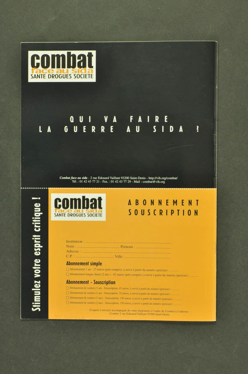 combat // face au sida // SANTE DROGUES SOCIETE // // QUI VA FAIRE // LA GUERRE AU SIDA? // // Combat face au sida - 2 rue Edouard Vaillant 93200 Saint-Denis - http://vih.org/combat/ // Tél.: 01 42 43 77 21 - Fax.: 01 42 43 77 29 - Mail: combat@vih.org // // // ABONNEMENT // SOUSCRIPTION [...] (Sur la quatrième de couverture, imprimés en noir, orange et blanc.), versoTexte