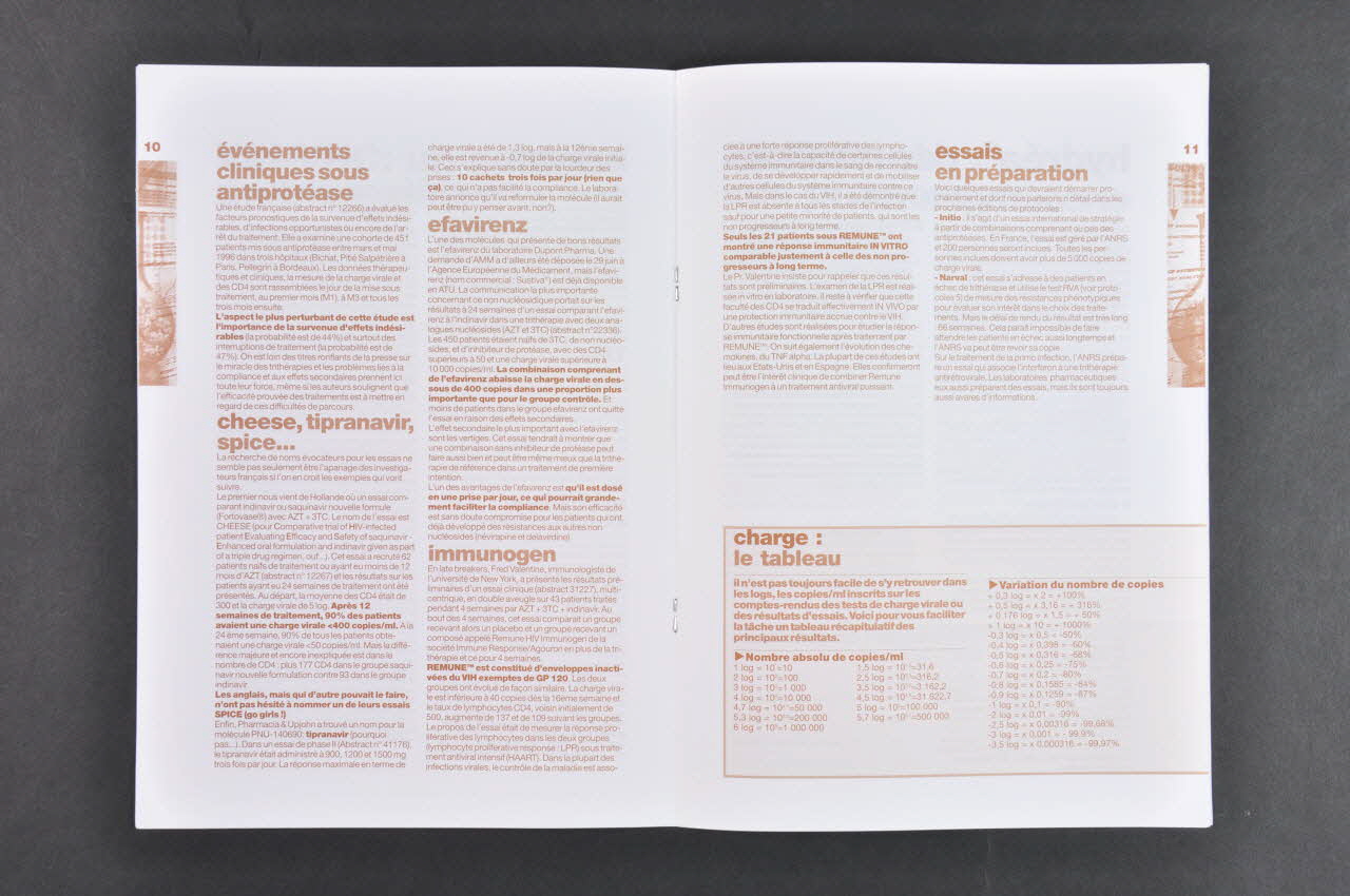 3 REPERES // SPECIAL GENEVE // 6 ADHESION // 7 RESISTANCES // 8 VIH/VHC // 9 BREVES // 12 HYDROXYUREE // 13 IL-2 // 14 ESSAIS // COMMENTES // 15 LIPOSYSTROPHIES // ZOOM // 16 LA SAGA DES IP // NABILONE // 18 GLOSSAIRE // 20 LE NERF DE LA GUERRE (En bas du bandeau vertical marron), sur la couvertureDate, numéro