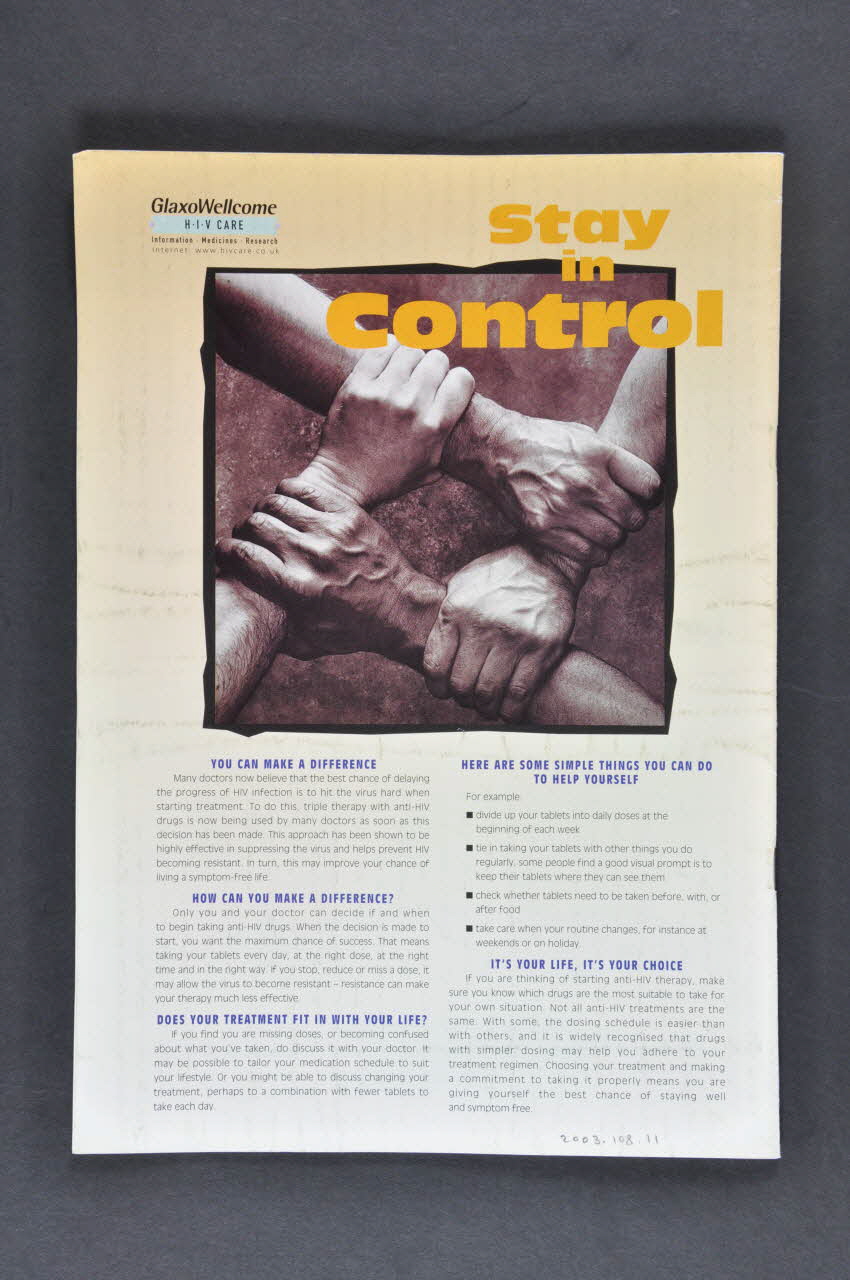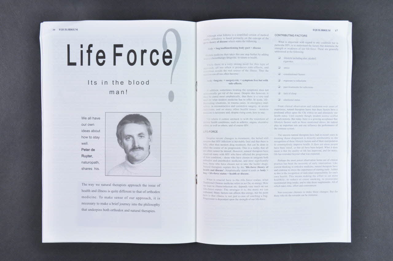 Cette revue en anglais au format A4 est un exemplaire de "Equilibrium Magazine". Celle-ci est composée de trente-deux pages imprimées en noir et blanc et reliées entre elles par deux agrafes dans une couverture plus épaisse présentant des couleurs. La couverture comporte le nom de la revue, la date et du texte imprimés en blanc dans le haut et dans le bas d'un fond noir. Le dos comprend une publicité de GlaxoWellcome avec, au centre, une photographie montrant quatre bras se tenant par les poignets. En dessous, des conseils pour bien prendre les traitements sont imprimés. Un sommaire est présent en page une. A l'intérieur, différents articles se succèdent ; le texte est généralement disposé en plusieurs colonnes et des photographies de petites dimensions illustrent les propos. Les pages sont numérotées dans le haut ; le numéro est accompagné du nom de la revue inscrit en capitales noires. La dernière page comporte un bulletin de commande pour les différents numéros du magazine.